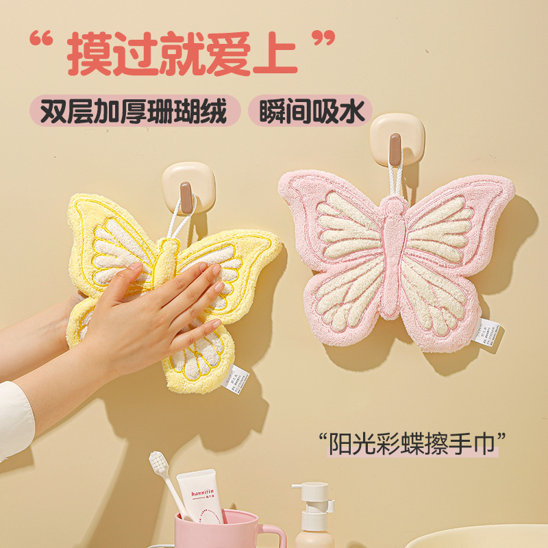 ハンドタオルコーラルベルベット蝶の形の複合スポンジハンドタオルハンギング漫画厚みのあるキッチン吸収性タオル