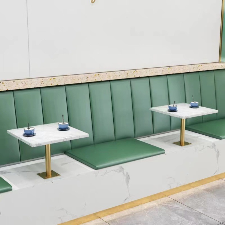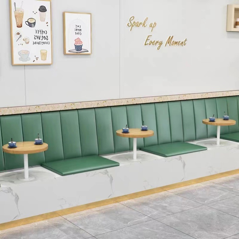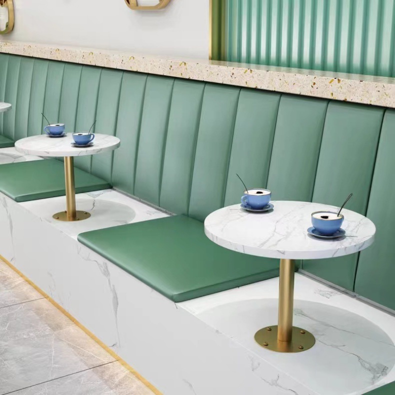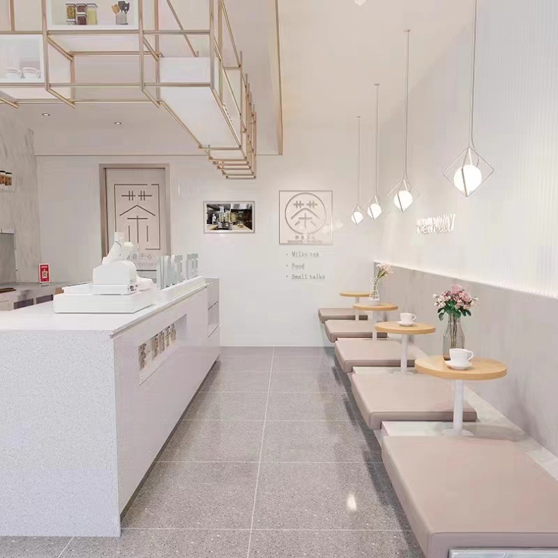 北欧は壁の喫茶店のテーブルのミルクティーの店の壁によってテーブルを詰めます。