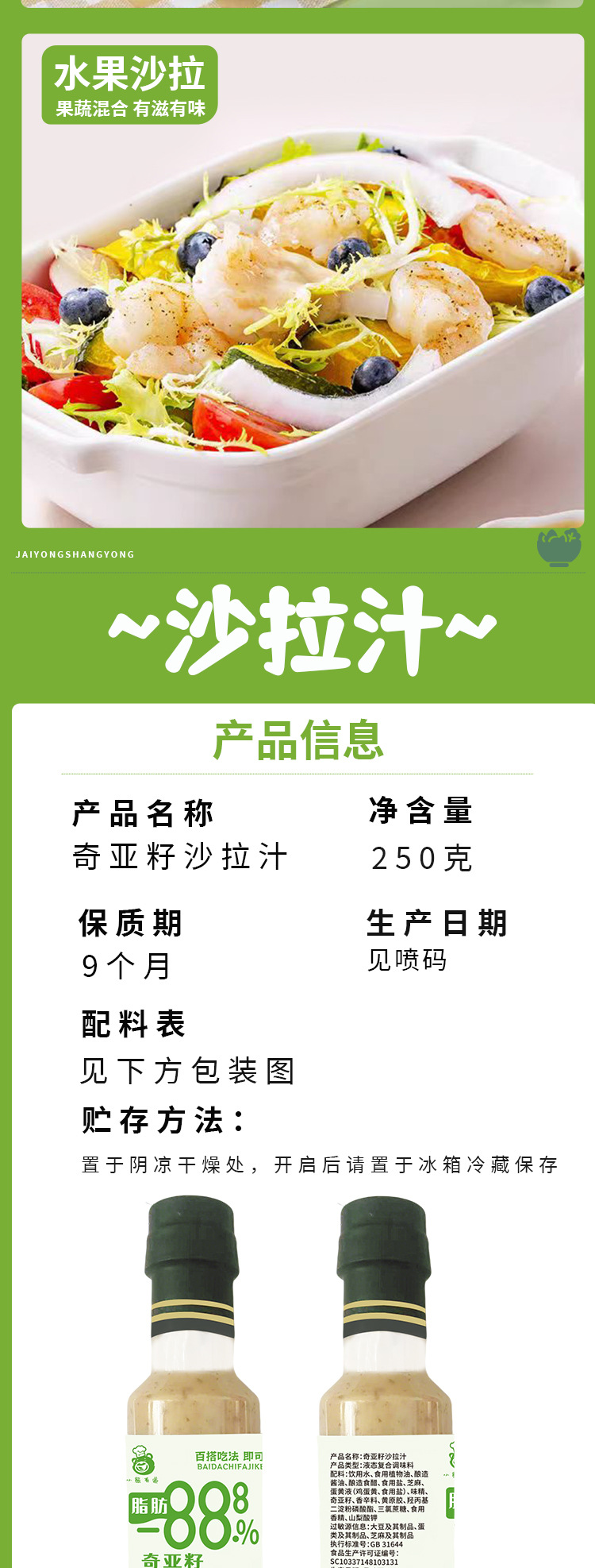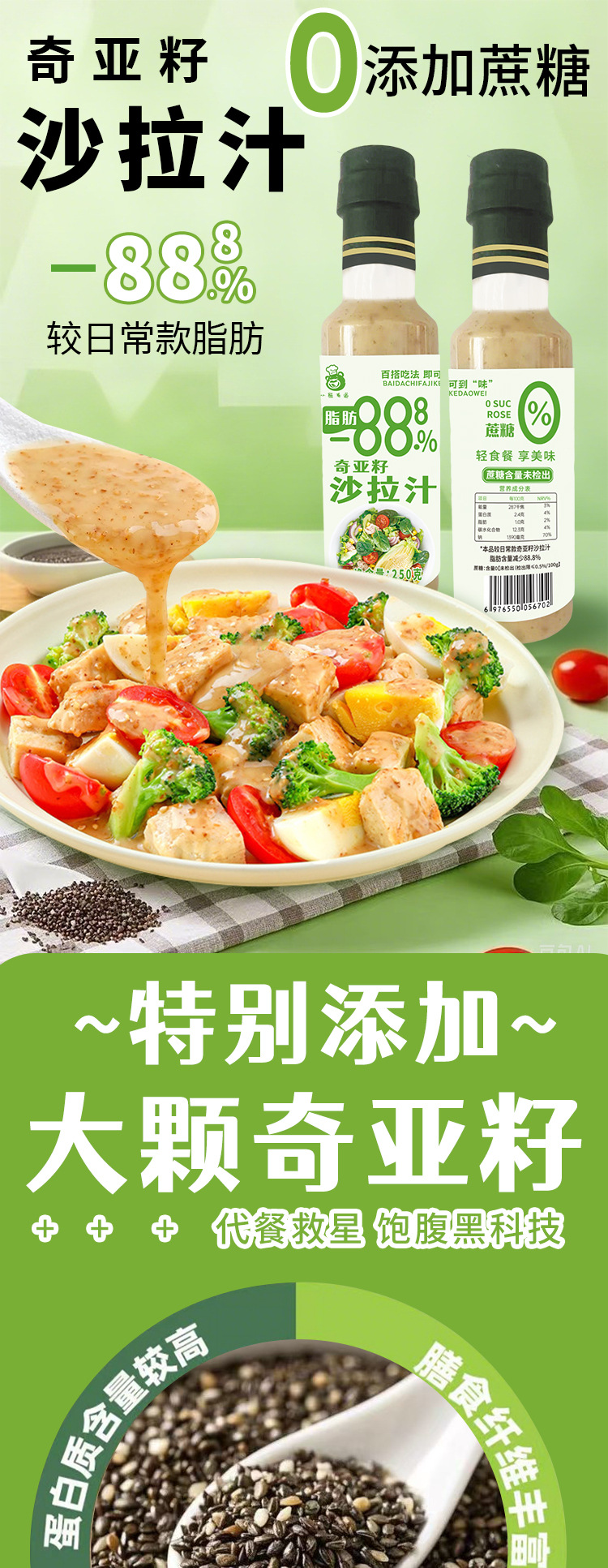 チアシードサラダドレッシング、野菜、果物、鶏のサラダ、家庭用、88.8%の脂肪を減らすサラダドレッシング