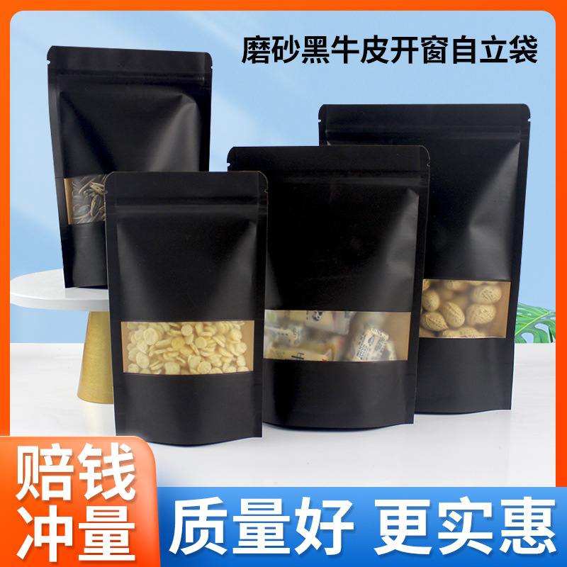 厚みのある黒いクラフト紙袋、自立食品包装袋、つや消し窓付きクラフト紙ジップロック袋、ドライフルーツシール袋