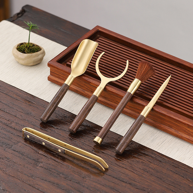 黄銅茶道六君子銅木茶挟み茶刀茶匙カンフー茶具部品杯叉養壺筆茶芸部品