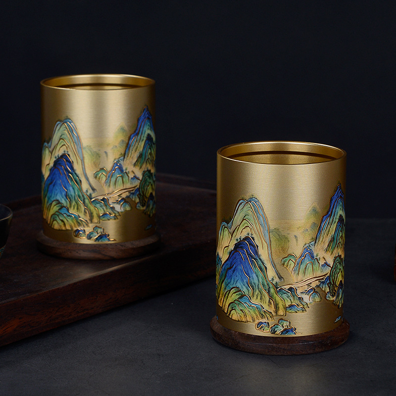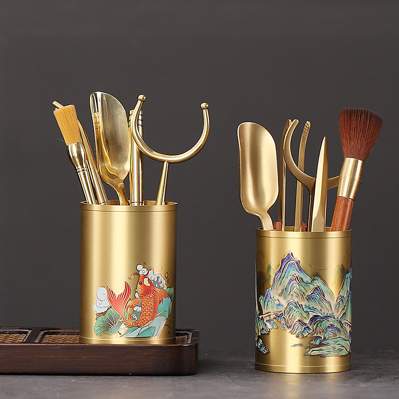 真鍮の筆筒の創意的なアイロンの絵の工芸の高級な事務室は一体の毛筆の収納筒の工夫の茶器の部品を収納します。