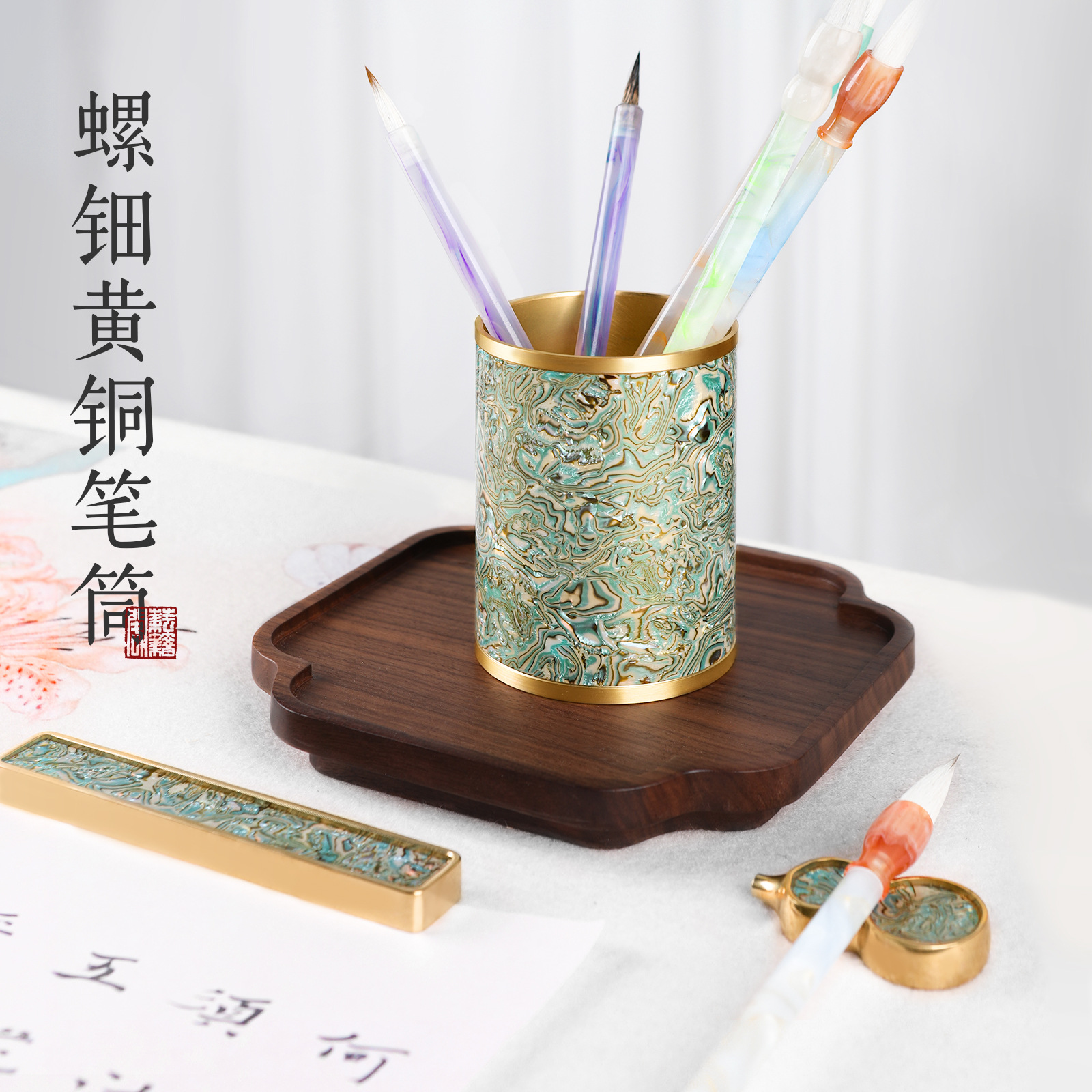 毛笔笔筒收纳盒螺钿黄铜金属笔筒创意高级感文房四宝桌面摆件笔筒