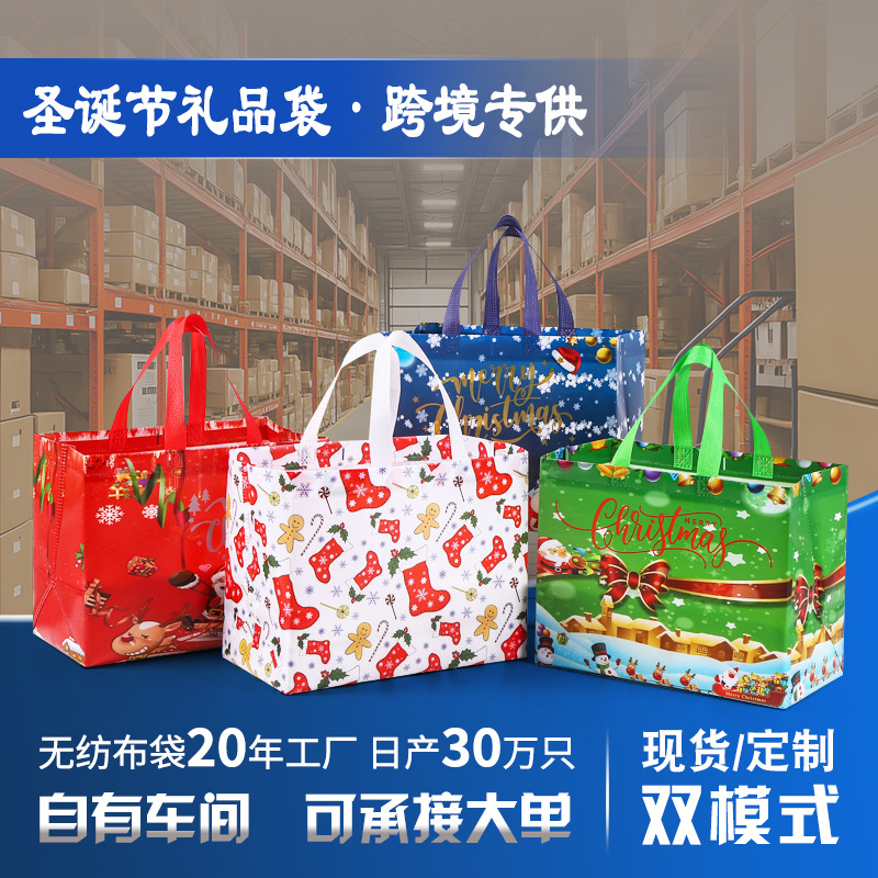 在庫ありクリスマスギフトバッグ、クロスボーダーラミネート不織布バッグ、カスタムメーカー卸売、ホットスタンピングロゴハンドバッグ