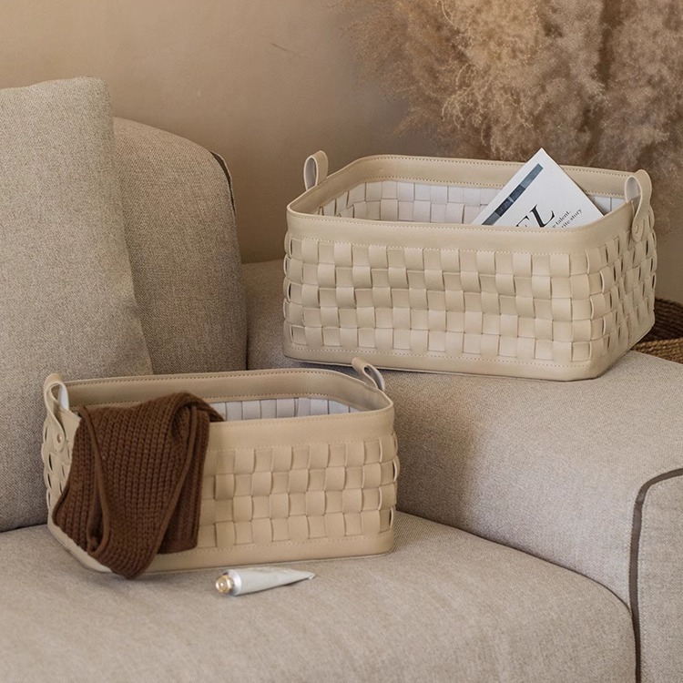 北欧桌面化妆品收纳手工编织马鞍皮桌面遥控器办公用品零食收纳筐