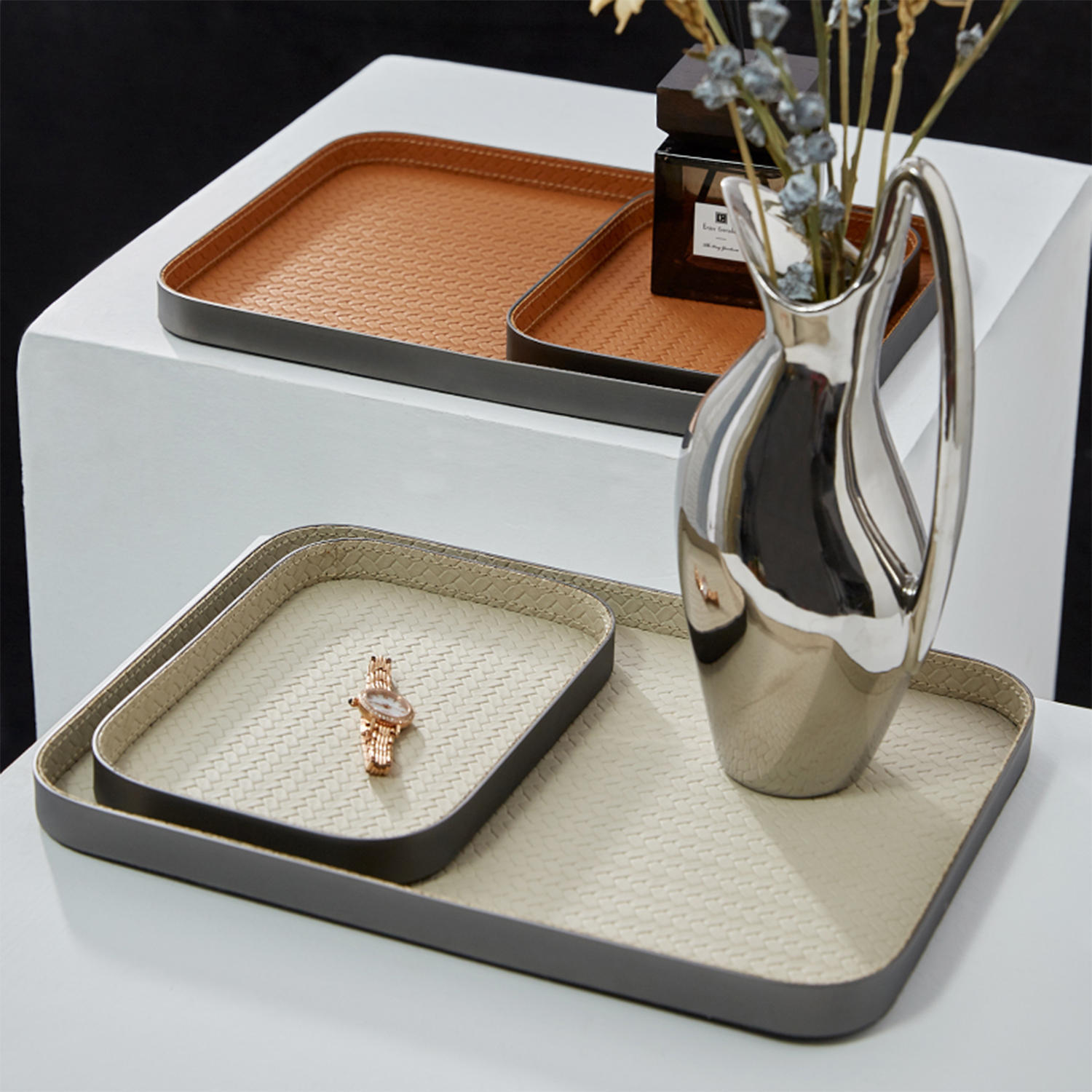 軽い贅沢な革トレイのデスクトップはリビングルームのお茶のセットを収納します。