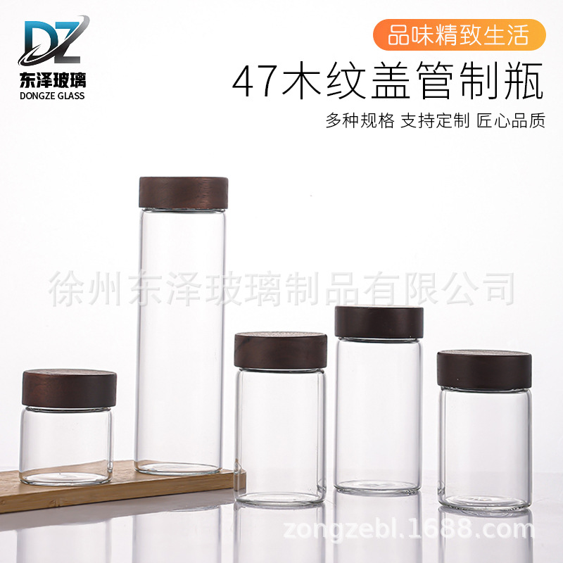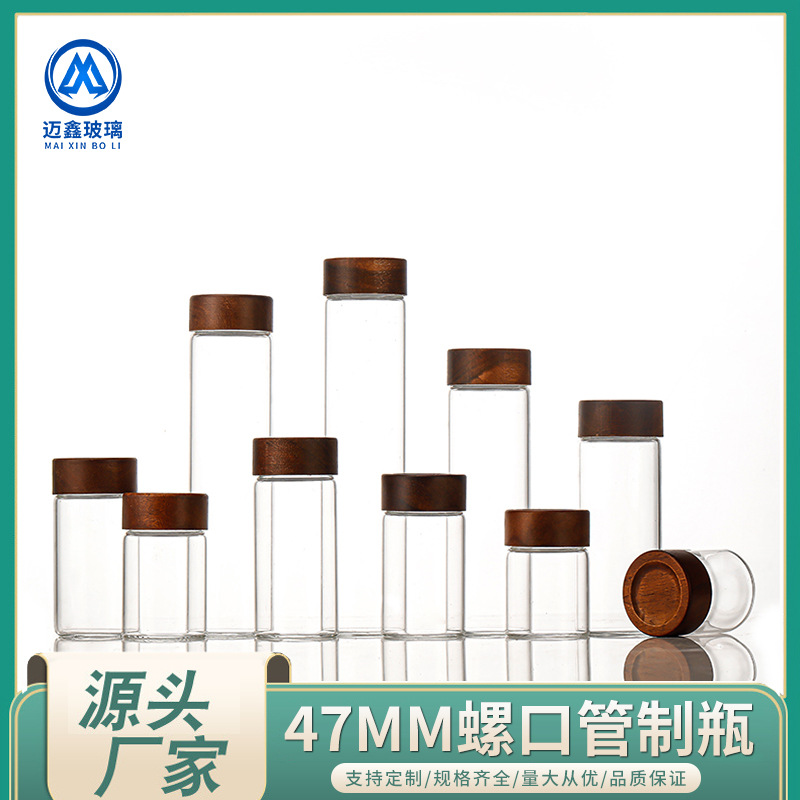 批发高硼硅管制瓶直径47mm木纹盖密封玻璃瓶可视化药丸粉末包装瓶