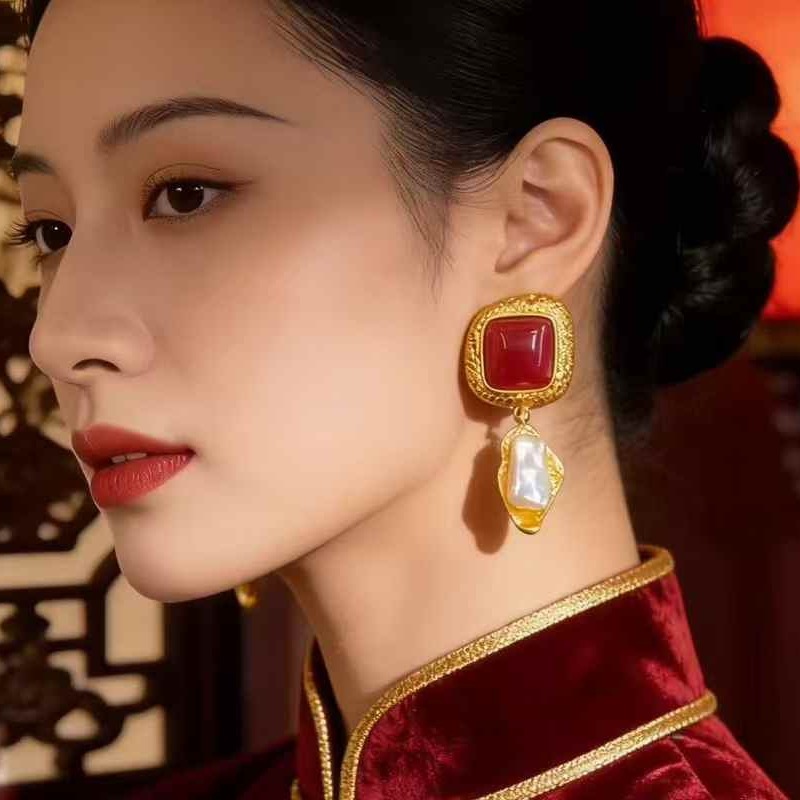 复古法式夸张暗红色气质耳钉925银针秋冬高级感异形珍珠耳环耳饰