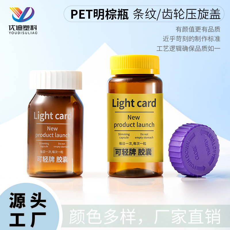 卸売り食品級petプラスチック明ブラウン瓶180-150ml歯車圧旋蓋プラスチック薬瓶縞圧旋蓋