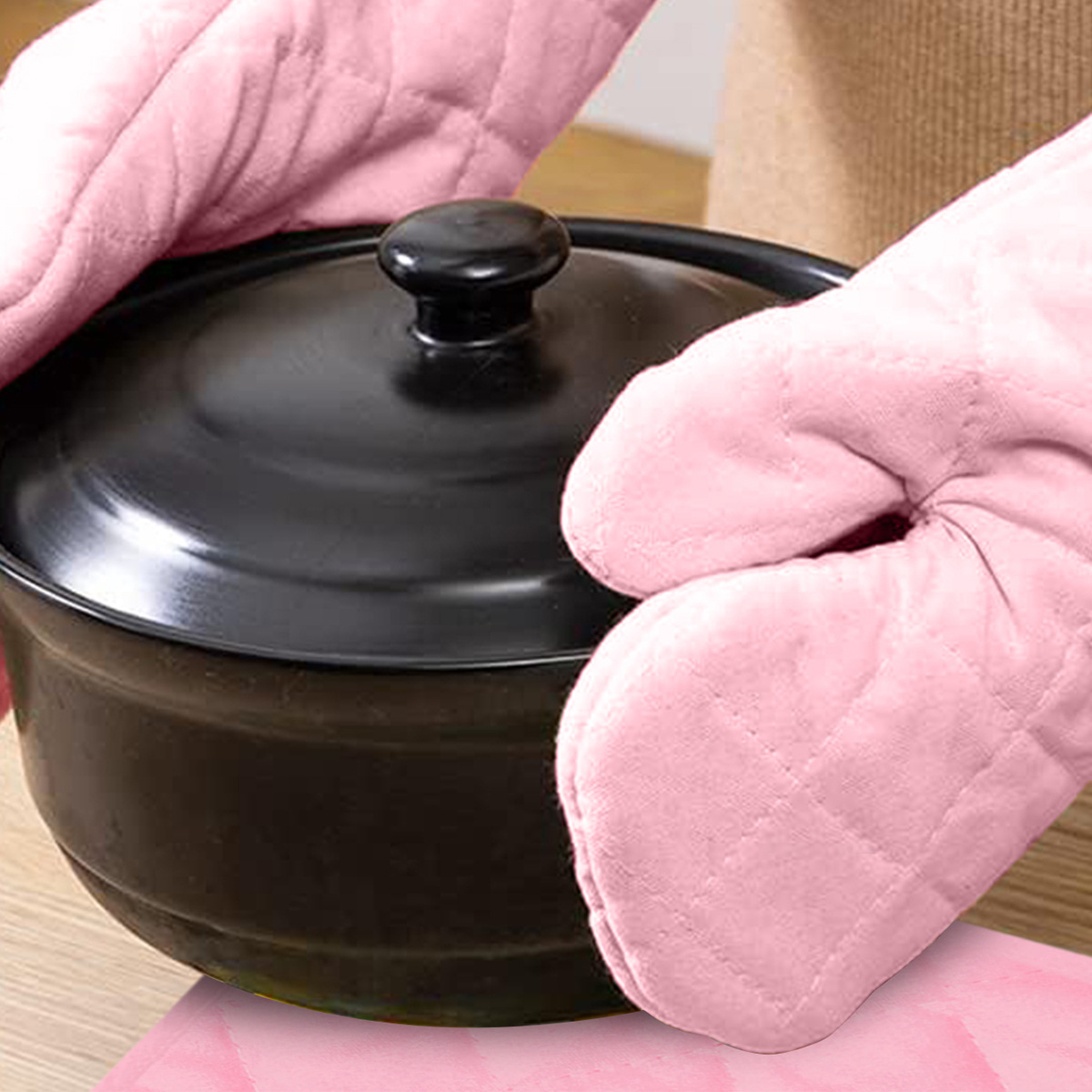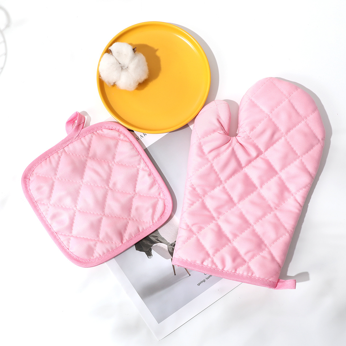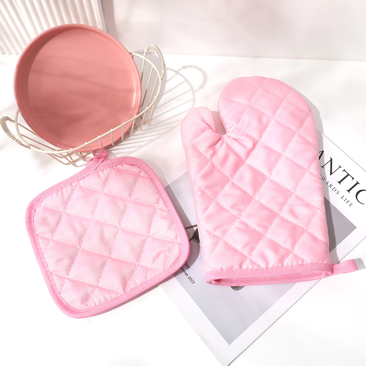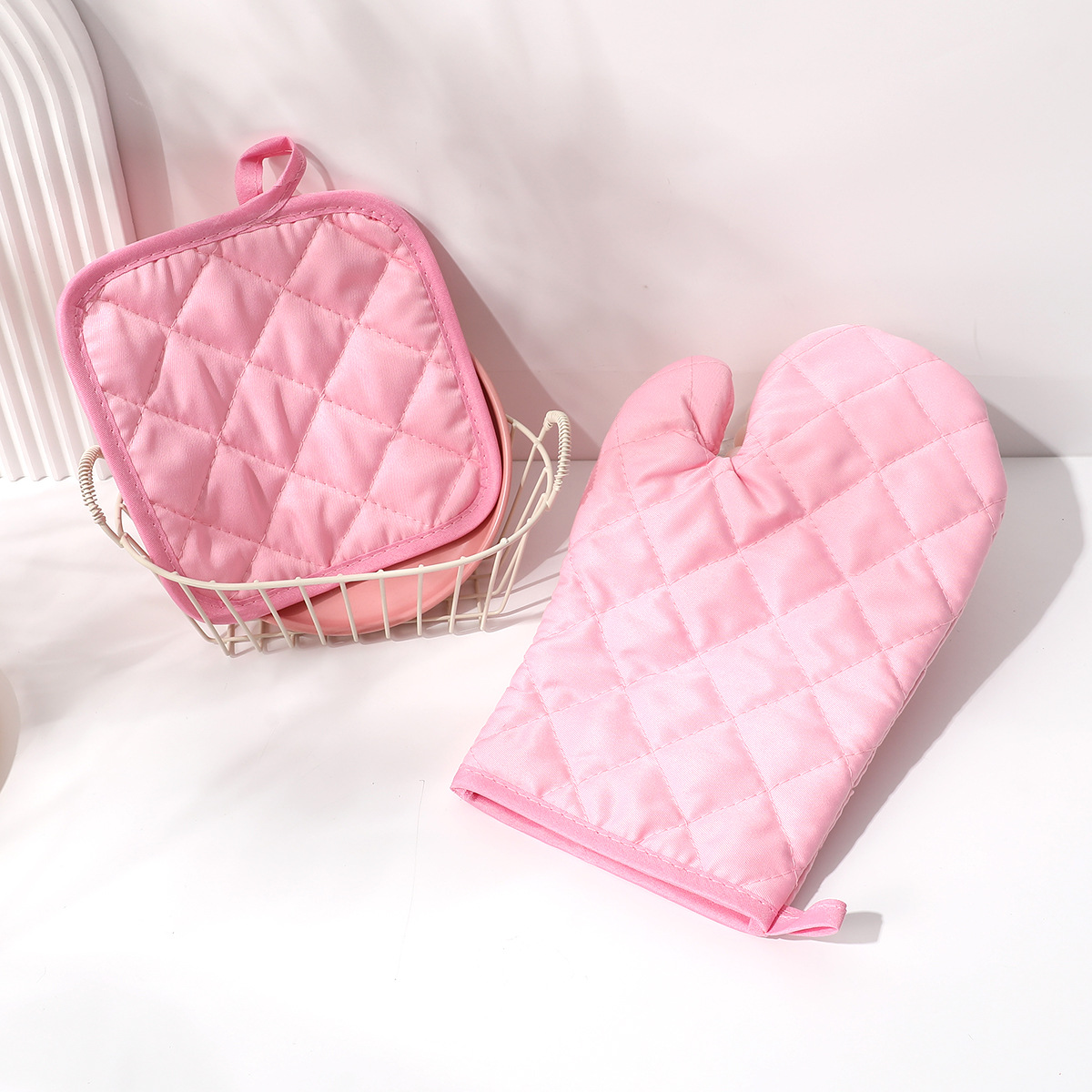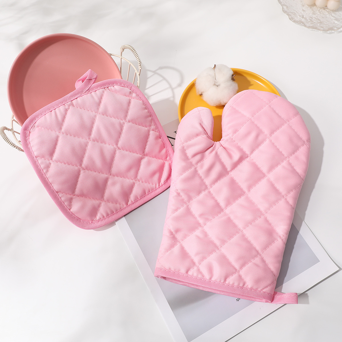ピンク格子断熱手袋セット手袋マット左右手汎用オーブン手袋デスクトップ保護マットパーマ防止