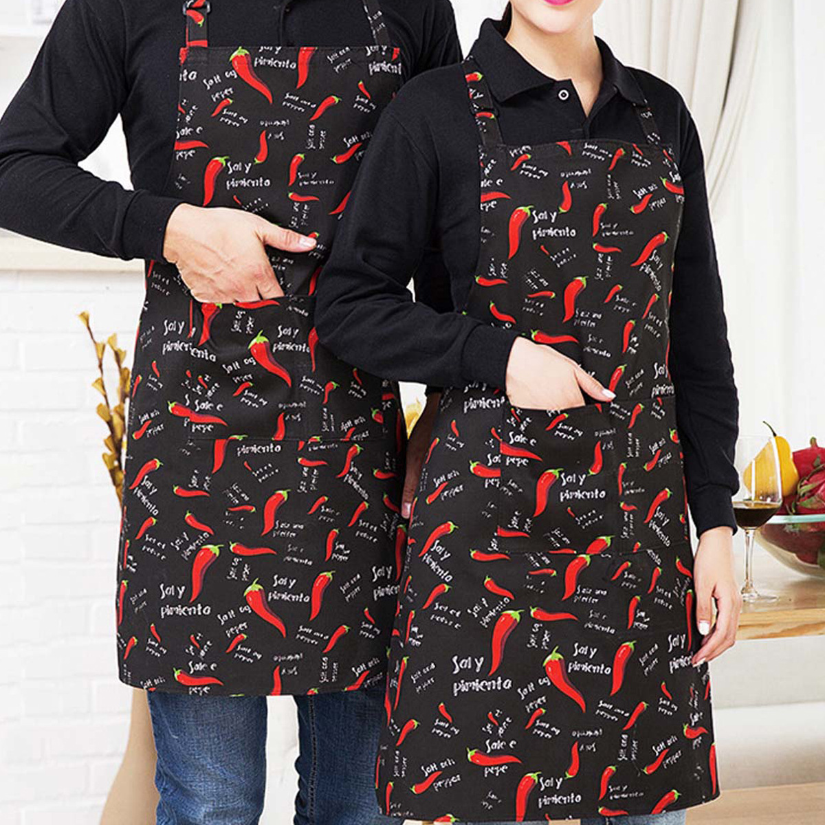 Amazon 防水性と耐油性のロングエプロン ダブルボタン調節可能な家庭用エプロン クッキングキッチン 男性と女性用 ブラックエプロン