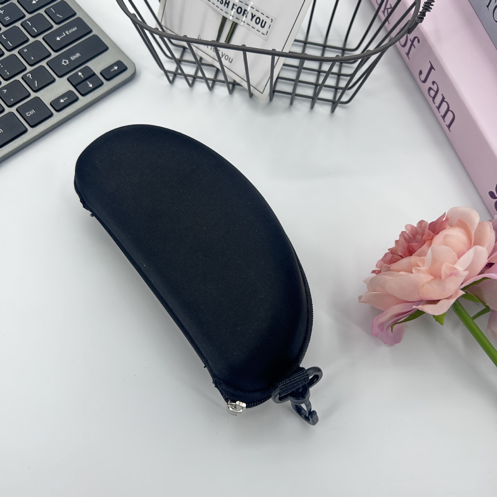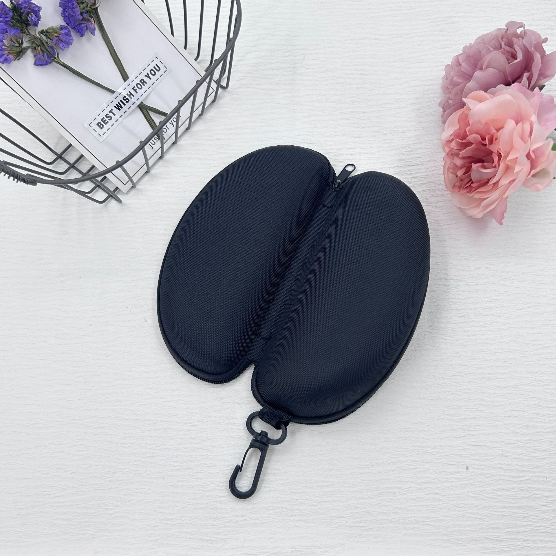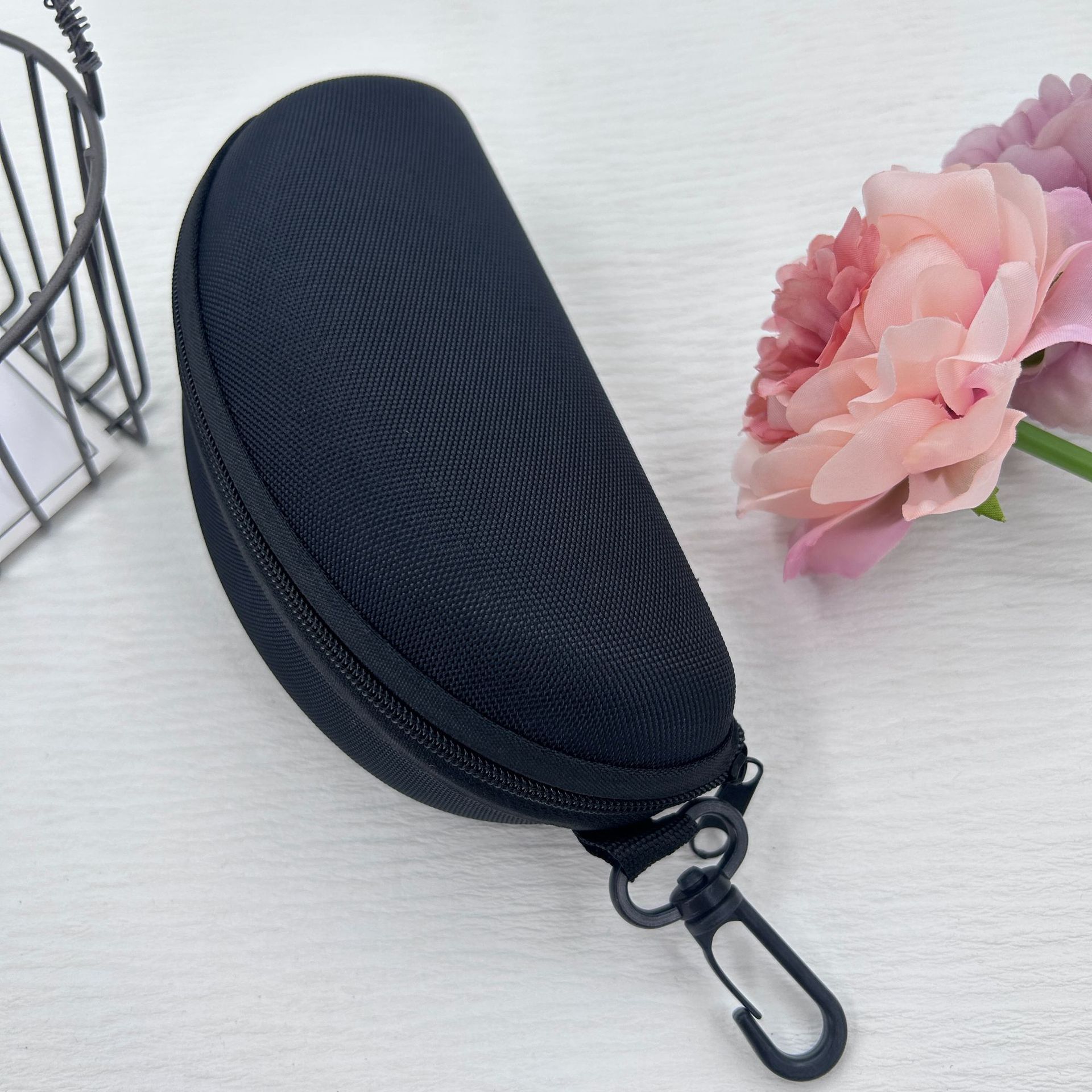 卸売EVA耐圧サングラスケース、ニット生地ジッパーバッグ、フック付き黒サングラスケース、汎用収納