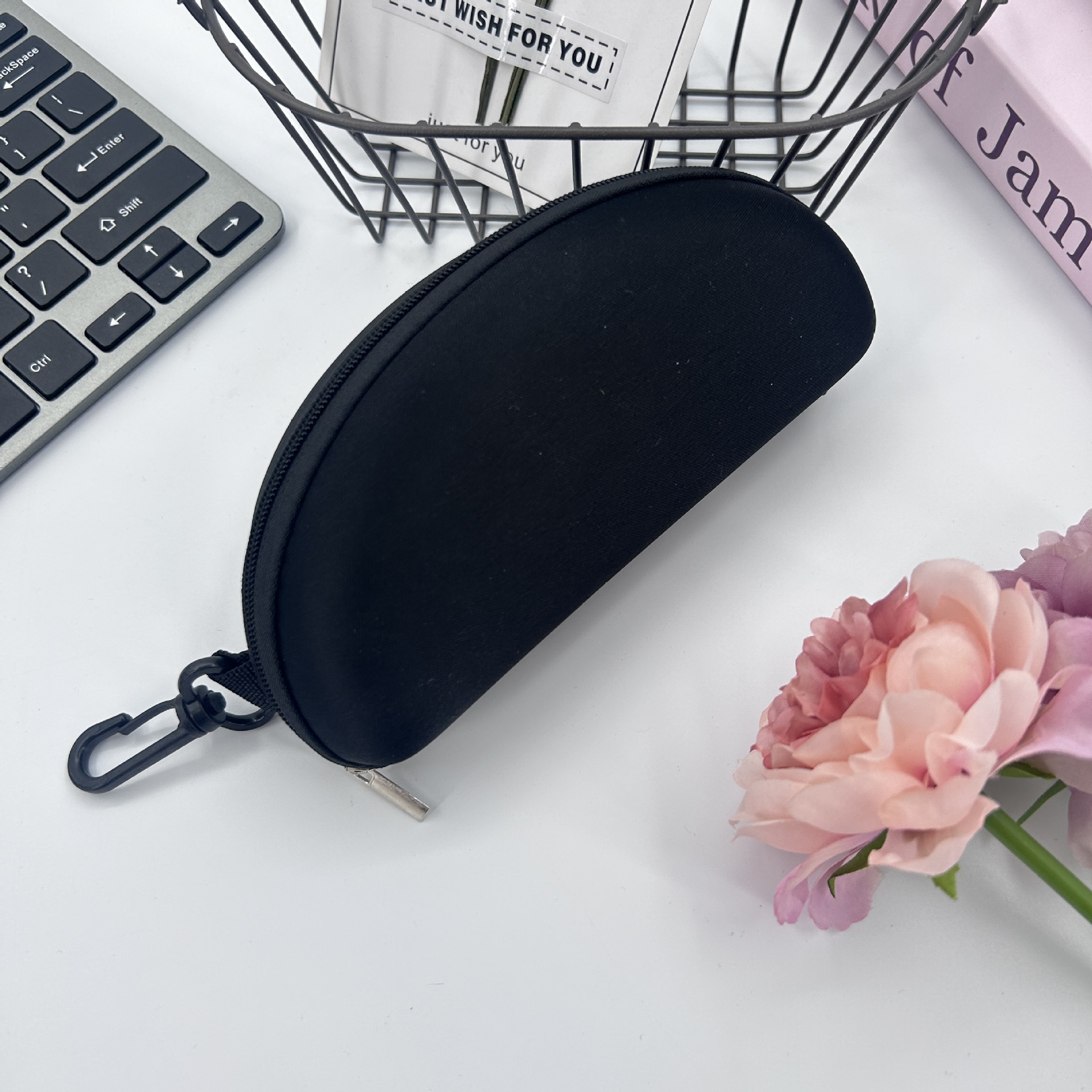 卸売EVAサングラスケース、ニット生地ジッパーバッグ、フック付き黒サングラスケース、収納用トレンディサングラスバッグ