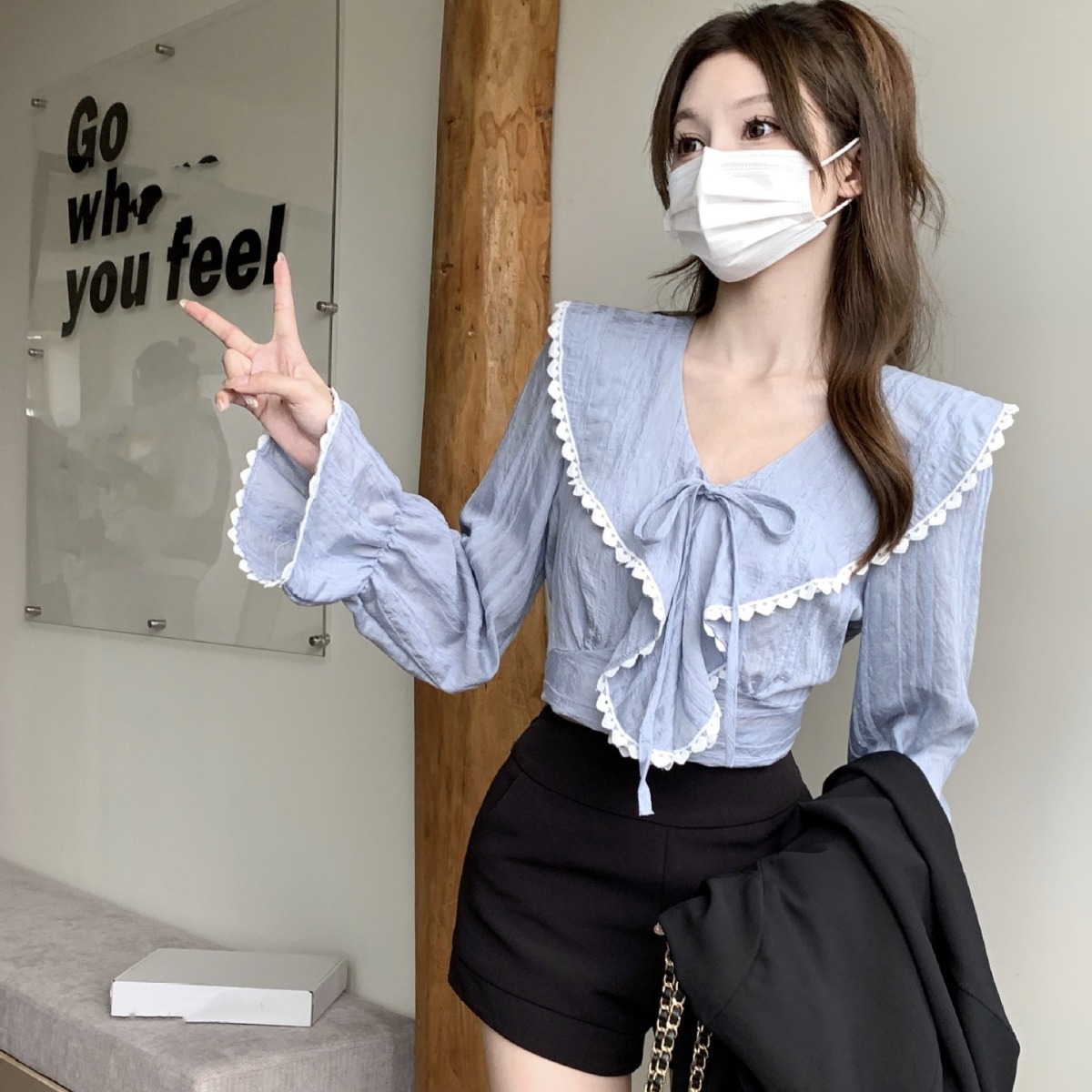 フランス式のハスの葉の辺の蝶結びのシャツの女性の早春の新型の短い長袖の底のシャツのデザイン感の青い上着の潮