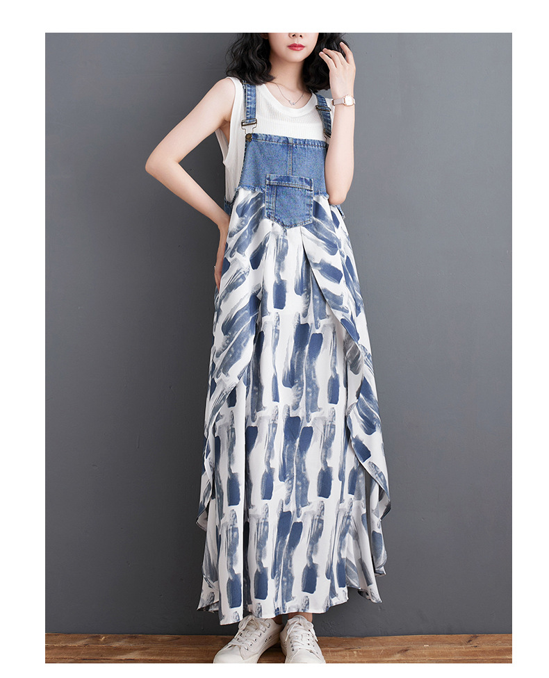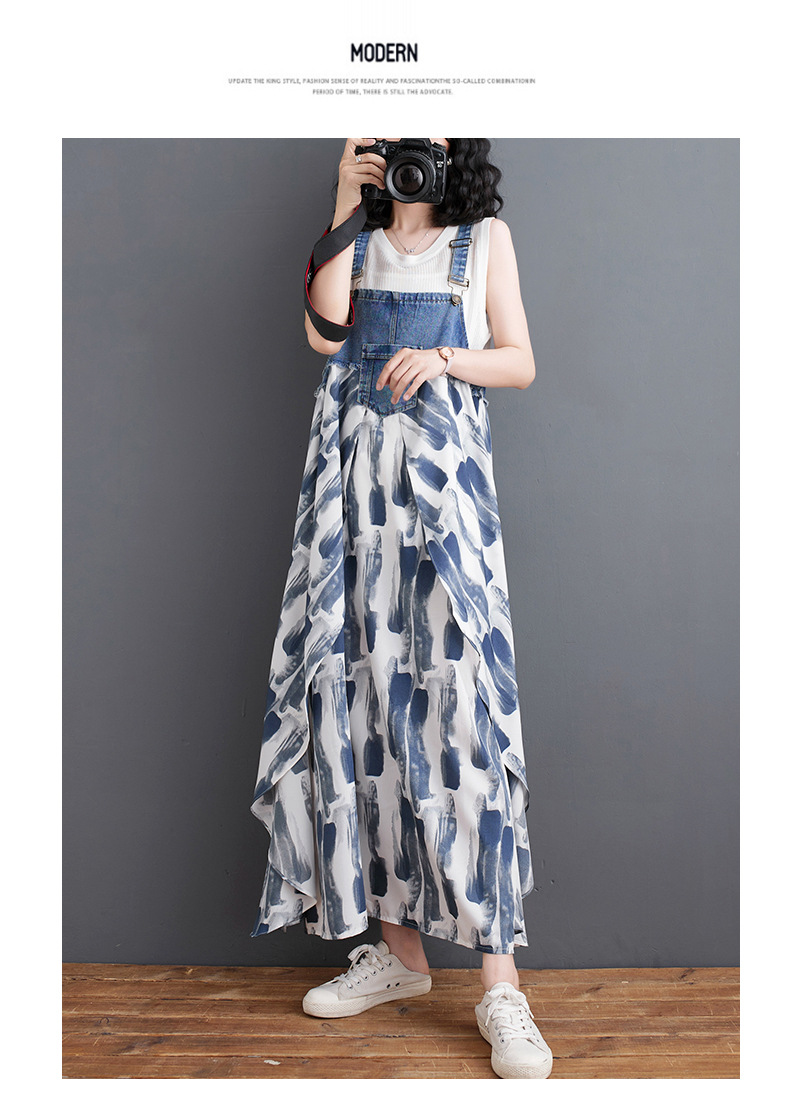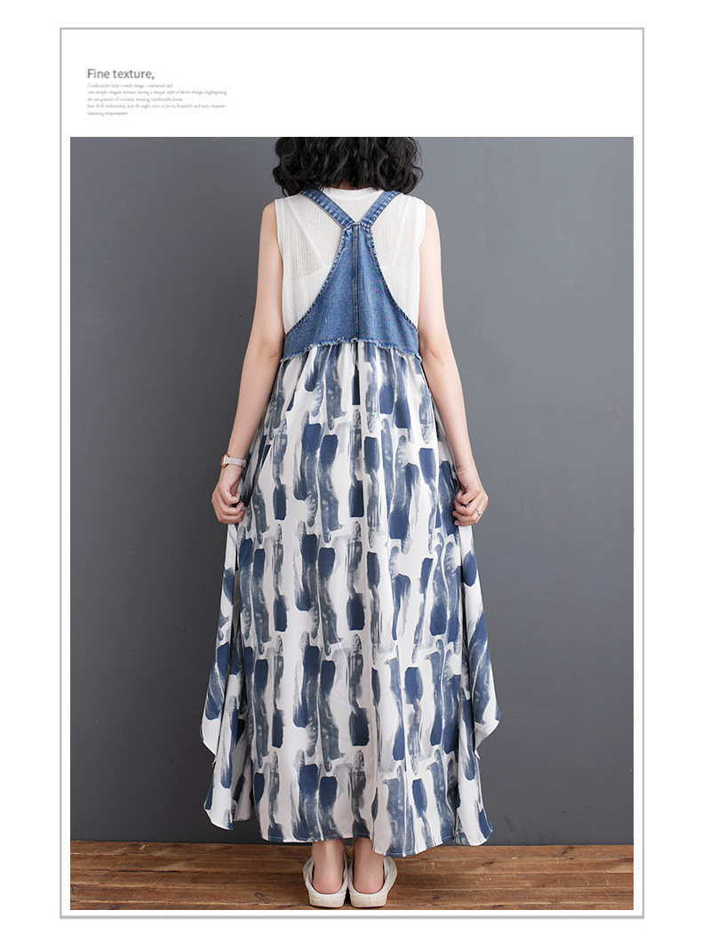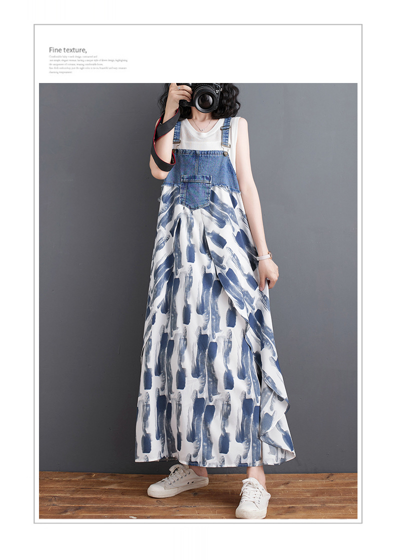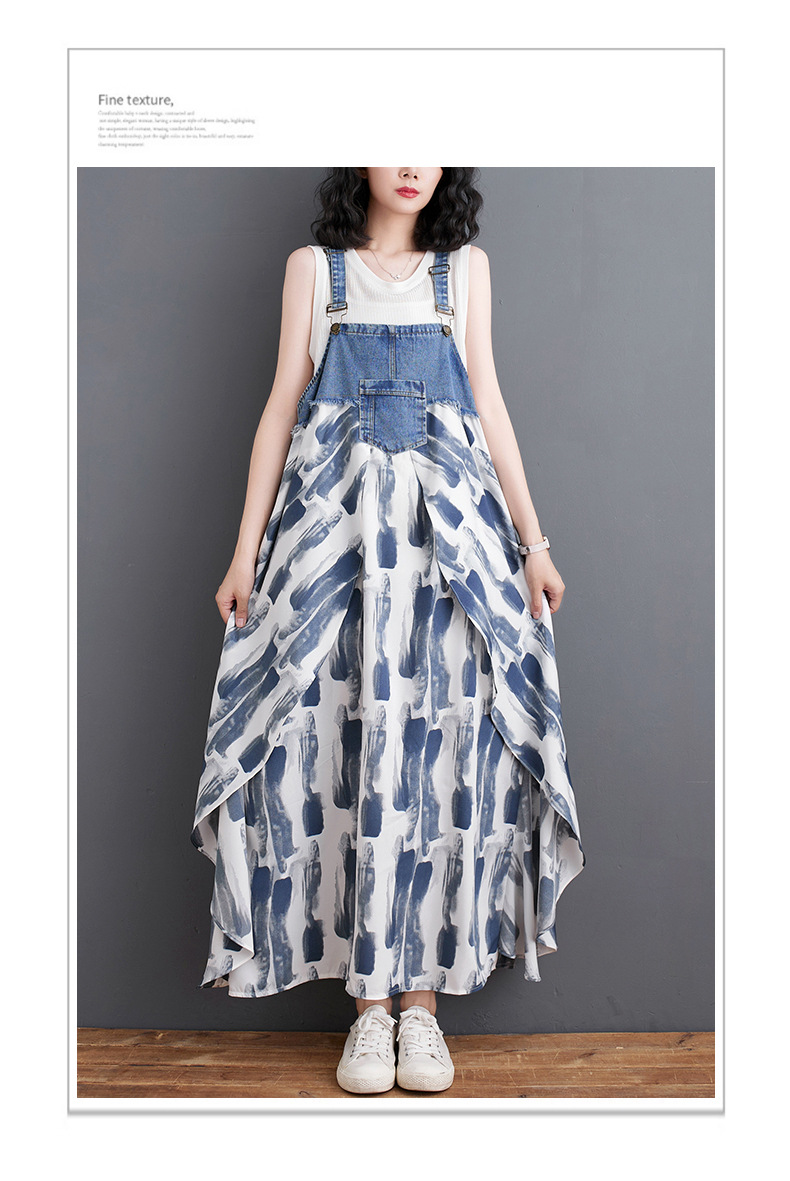ハスの葉のほとりのゆったりしたシフォンのプリントのデニムのデザイン感のバックリボンの中の長いワンピース