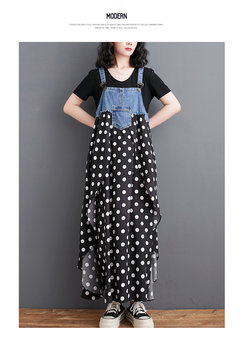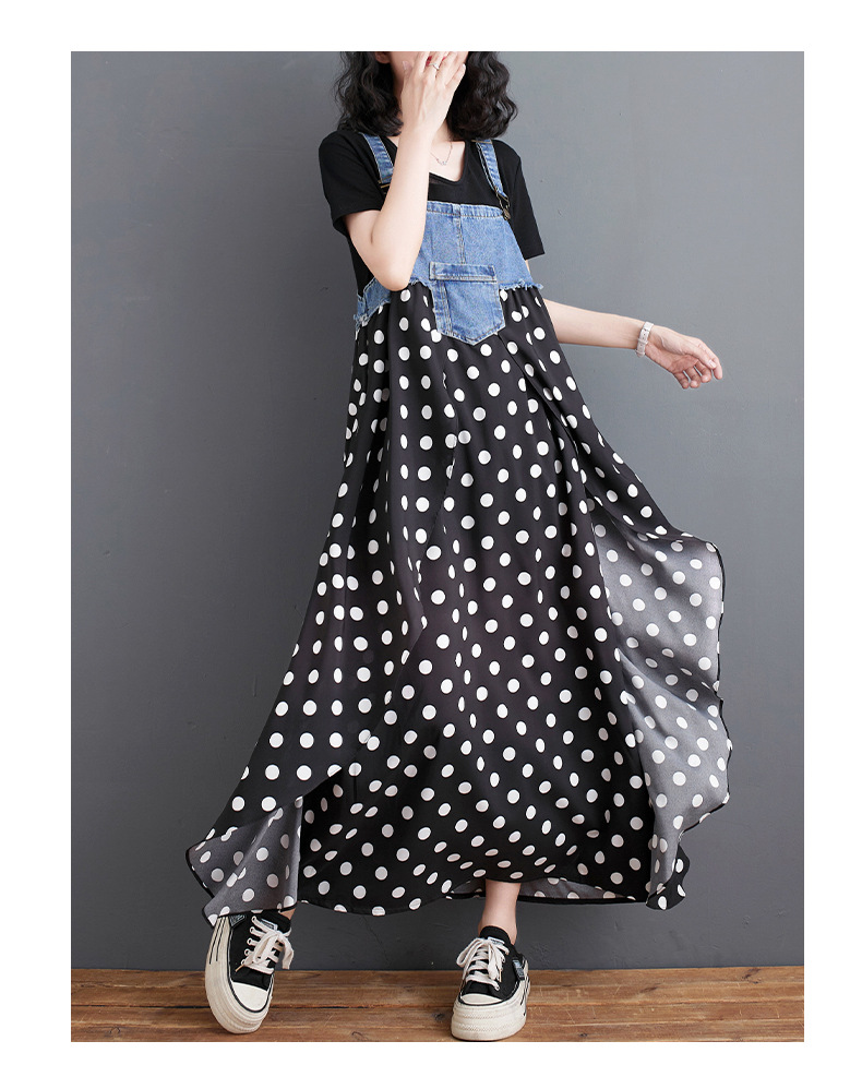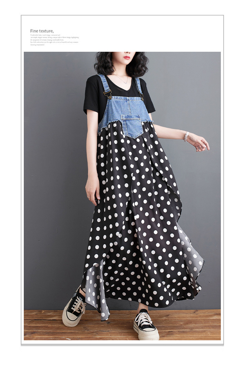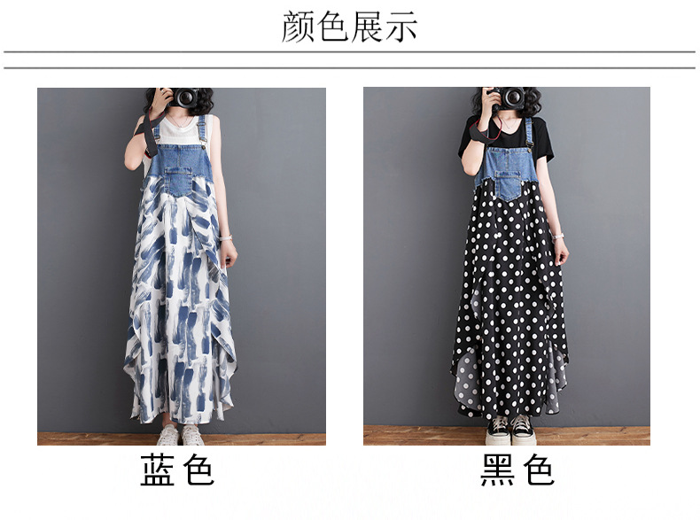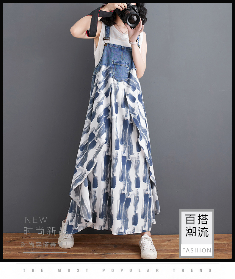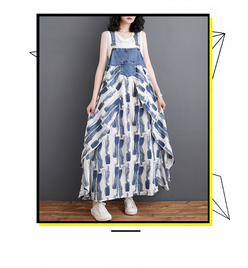 ハスの葉のほとりのゆったりしたシフォンのプリントのデニムのデザイン感のバックリボンの中の長いワンピース