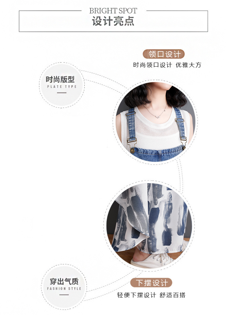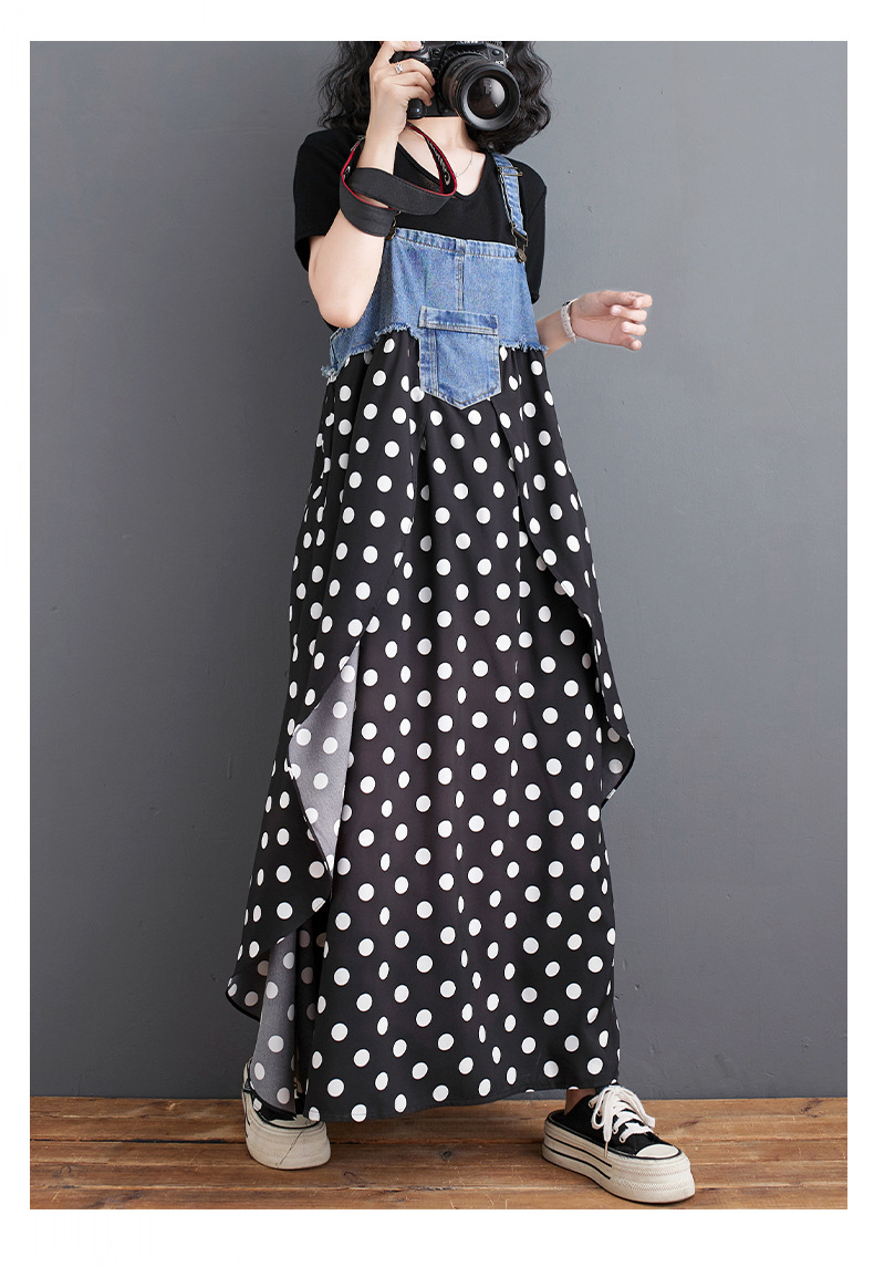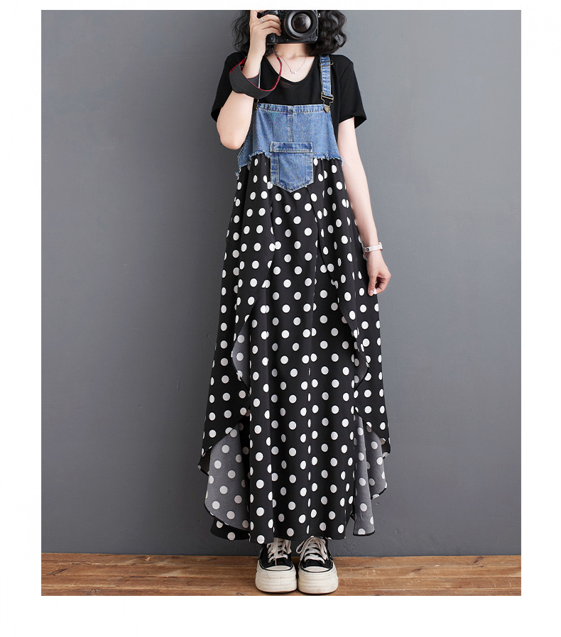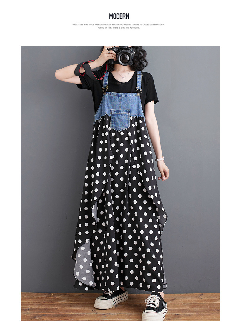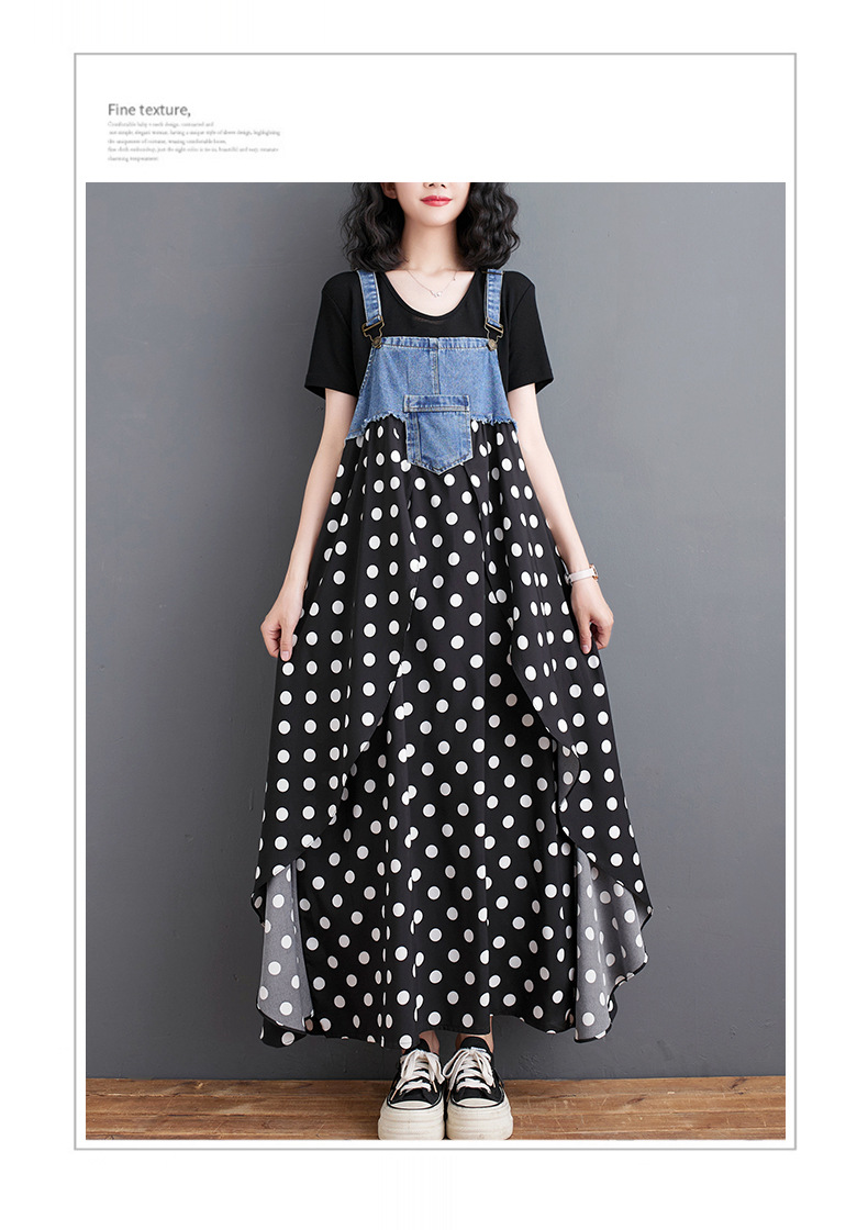 ハスの葉のほとりのゆったりしたシフォンのプリントのデニムのデザイン感のバックリボンの中の長いワンピース