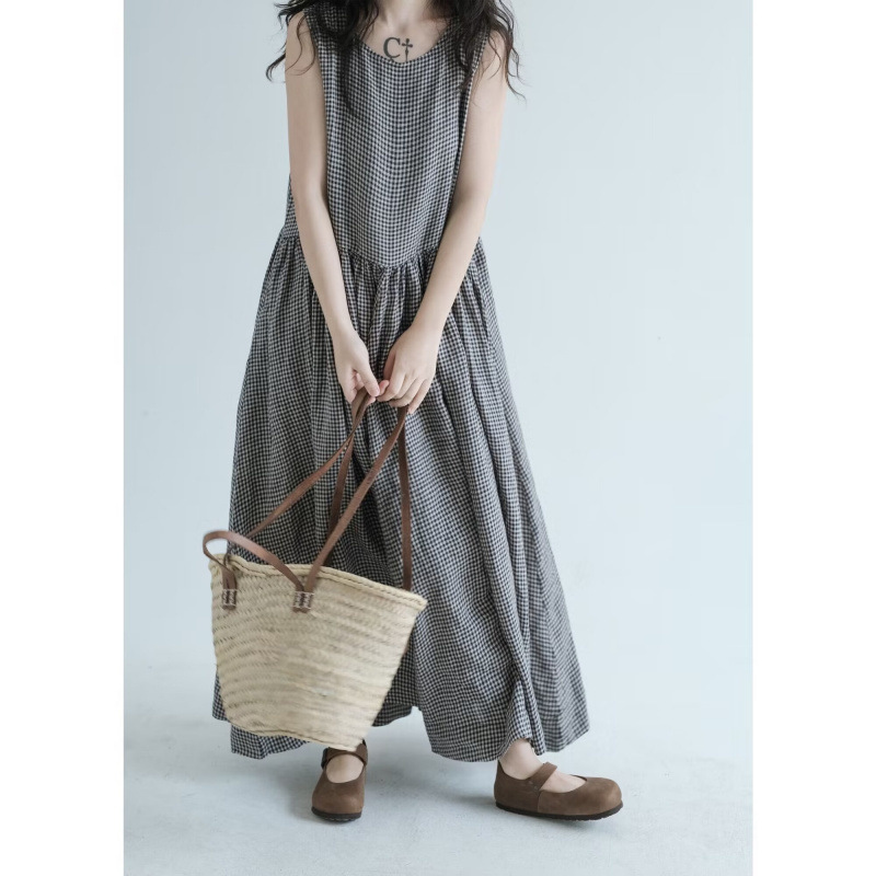 夏の新型綿麻の大きいサイズの格子の袖なしのベストのスカートのゆったりしたカジュアルなワンピース