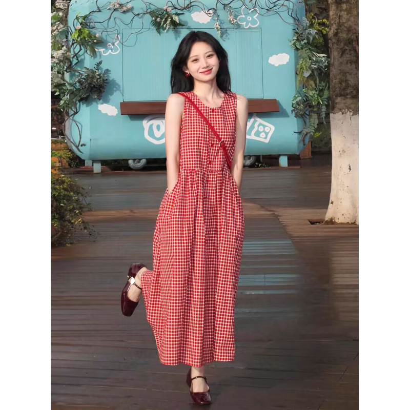 韩系红色格子开叉无袖连衣裙女遮肚子显瘦背心裙漂亮独特气质长裙