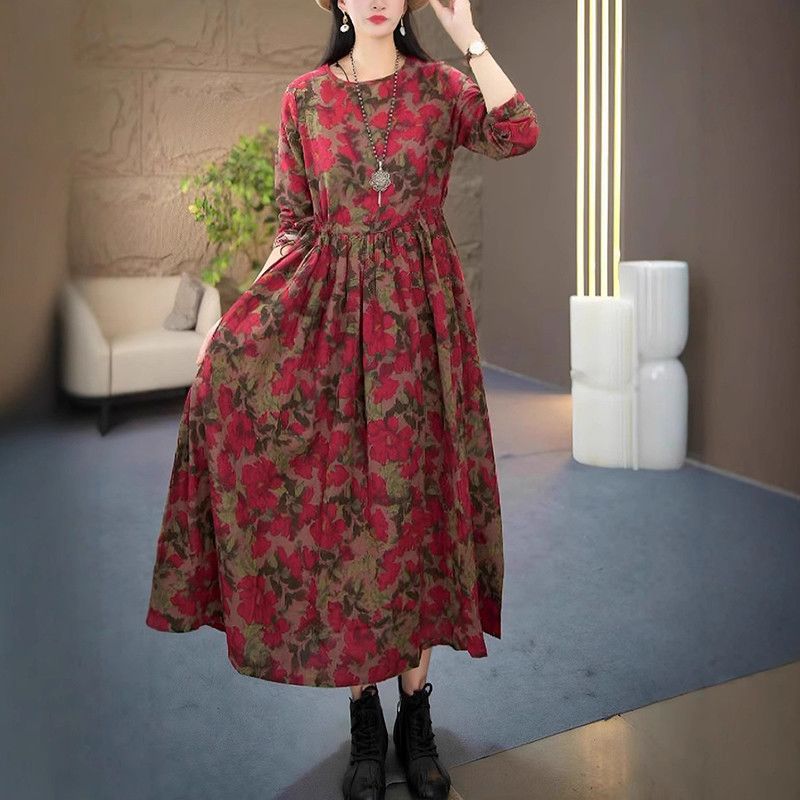 新しいプラスサイズの女性の 2024 秋と冬レトロ文学気質ロングスカート綿とリネンジャカード肥厚ドレス女性のための