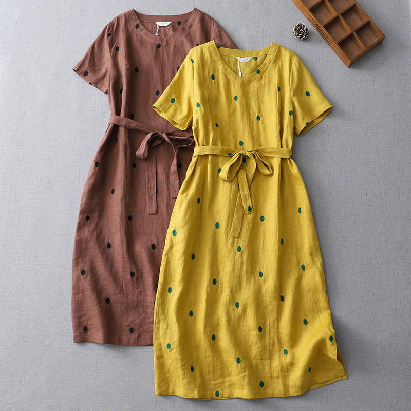 水玉模様の麻ワンピース 夏用 レディース ゆったり 大きいサイズ ぽっちゃりさん向け ウエストシェイプ 着痩せ効果のある レースアップ ミディアム丈ワンピース