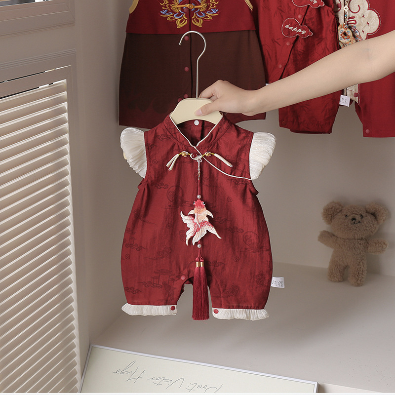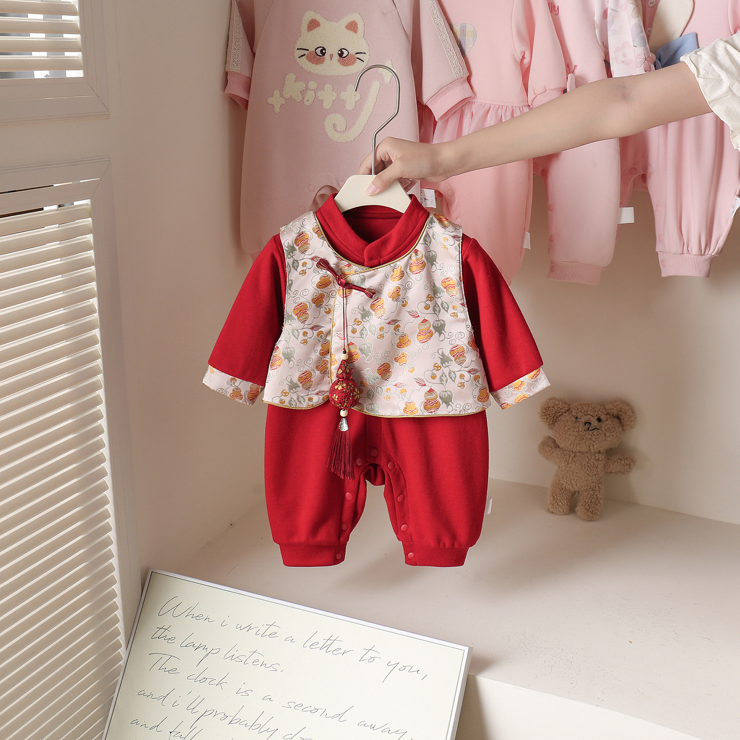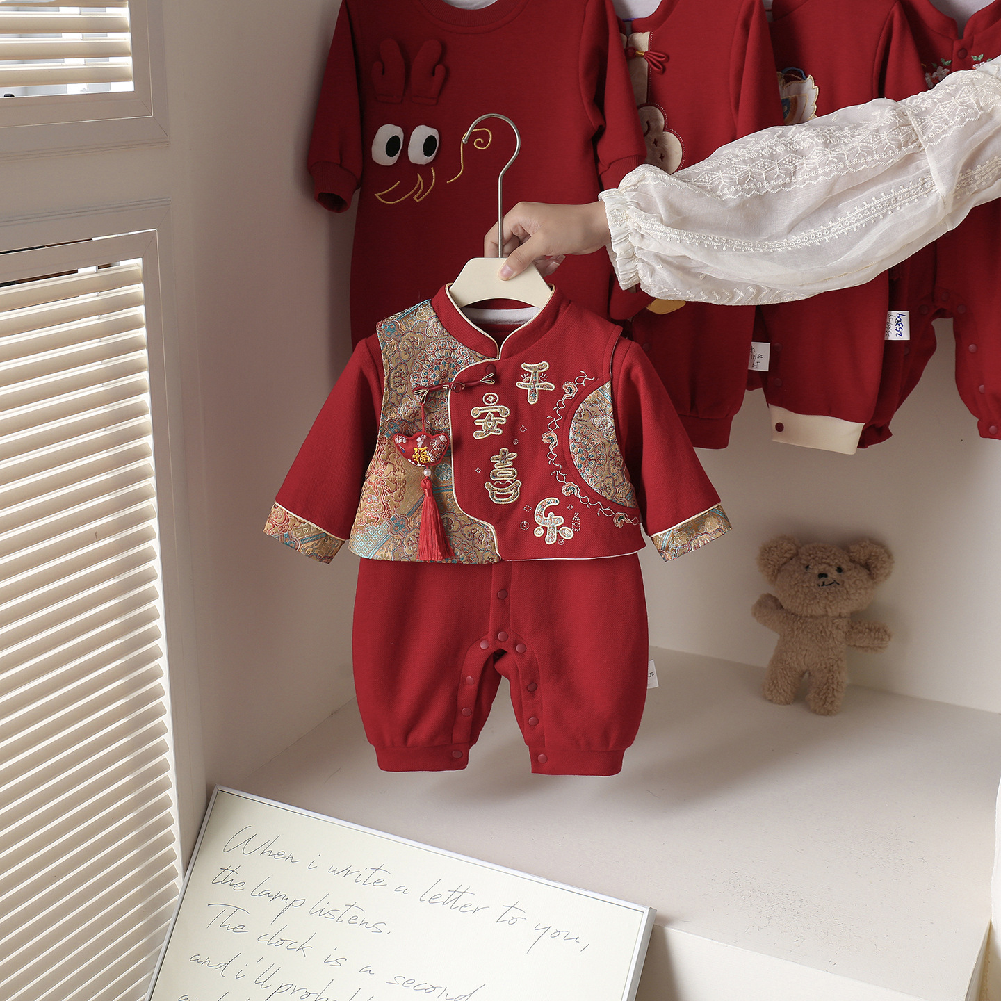 周岁宝宝中式套装礼服2025秋季新款婴幼儿连体衣红色喜庆生日套装