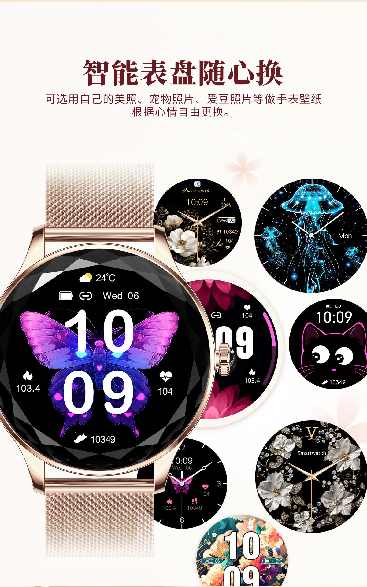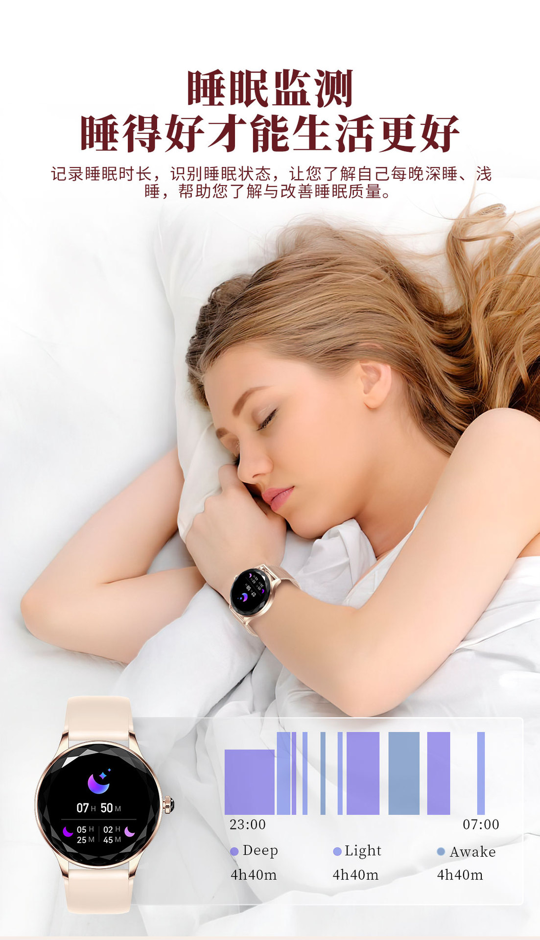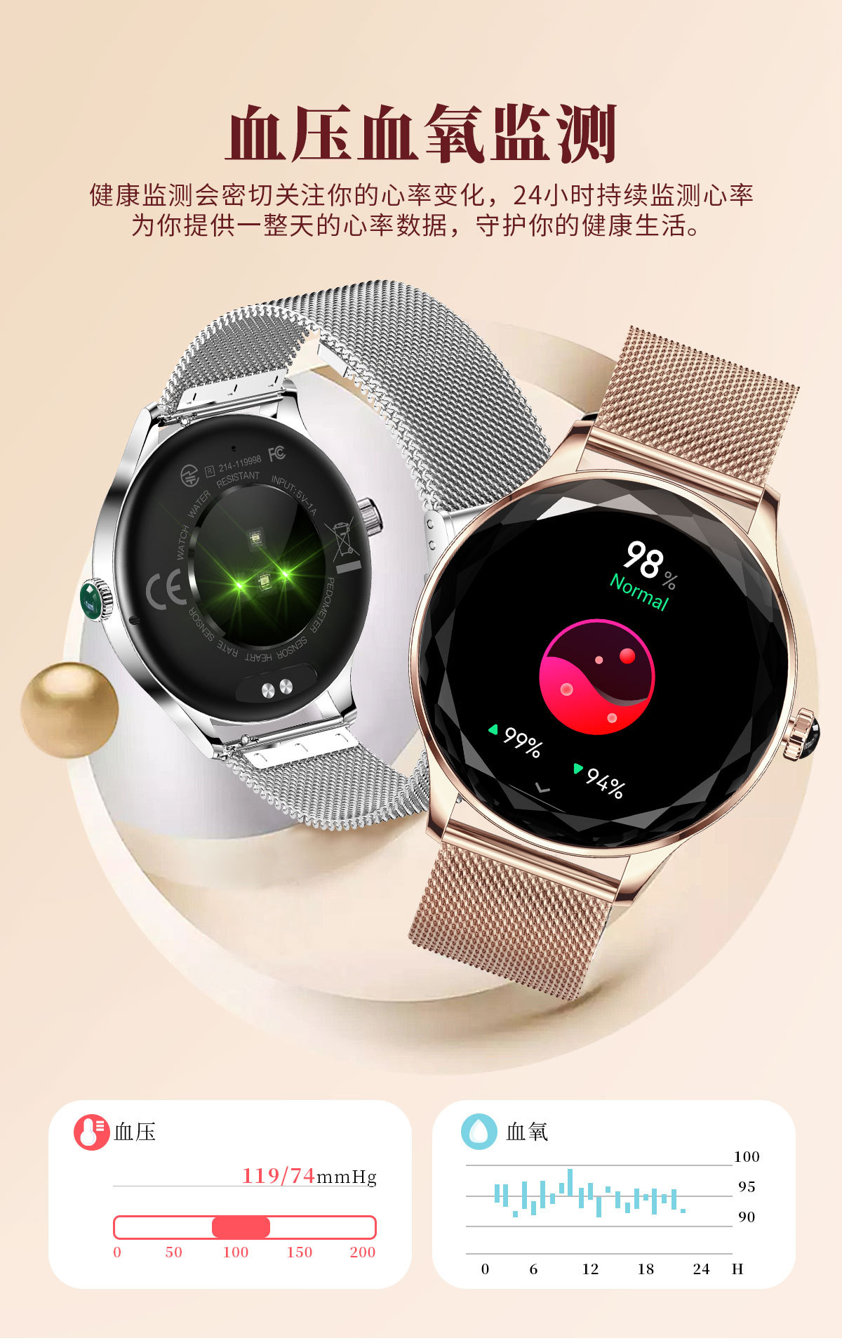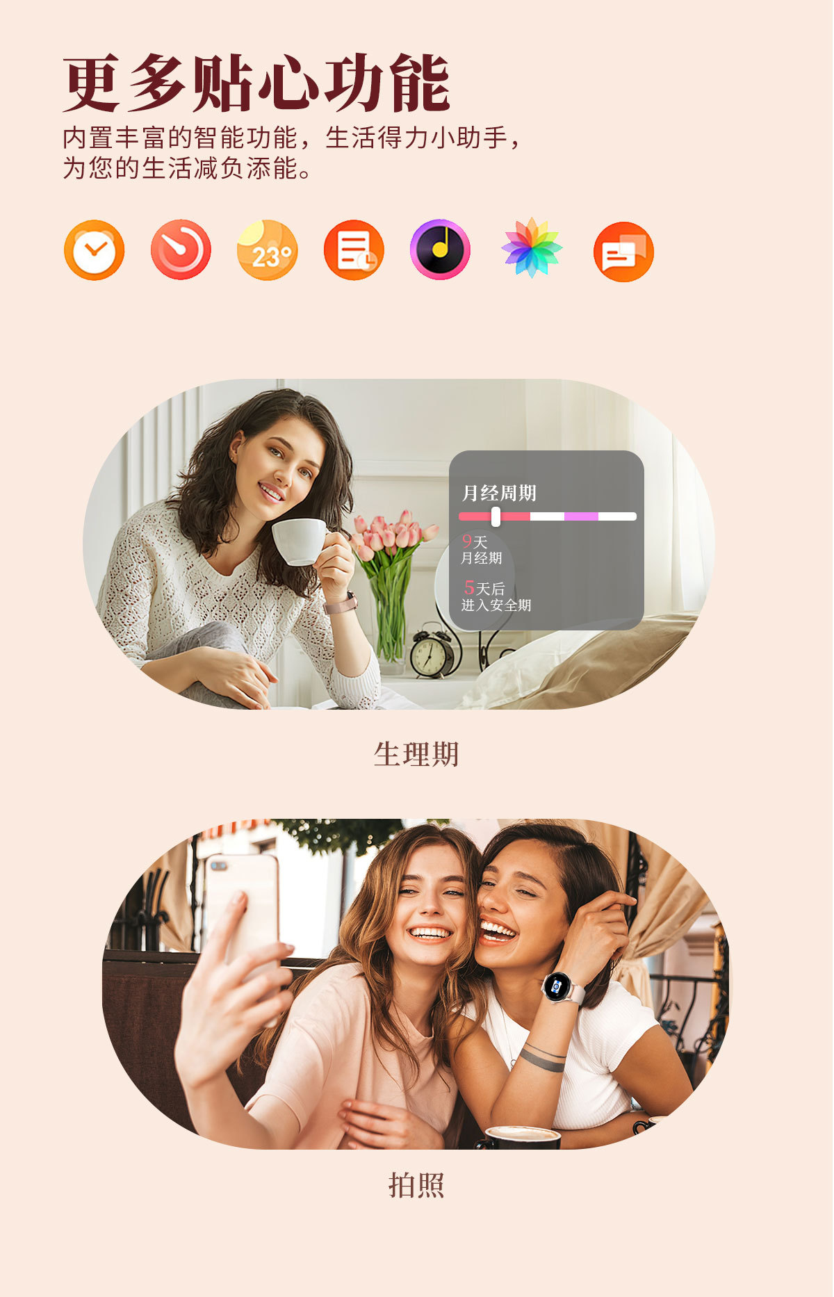 機能 防水,写真を撮る,ステップ,心拍数モニタリング,血圧測定,社交娯楽,Bluetooth通話,スマートリマインダー,リモコン自撮り,睡眠モニタリング