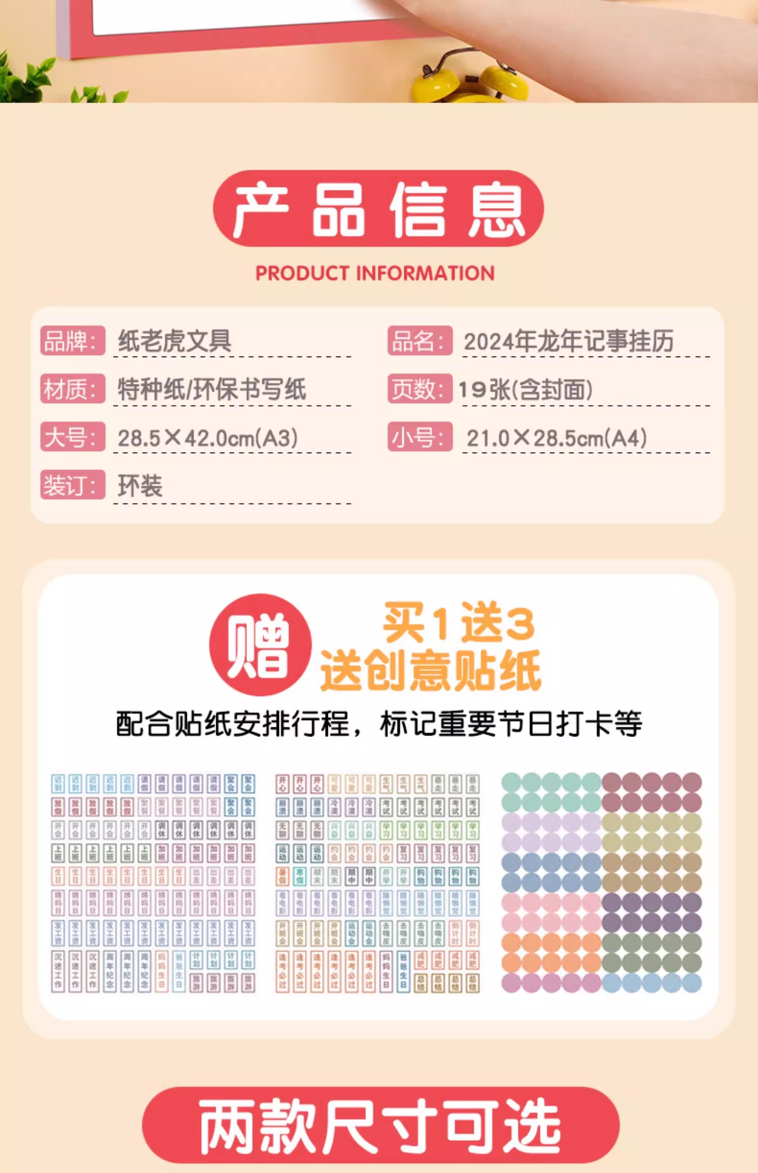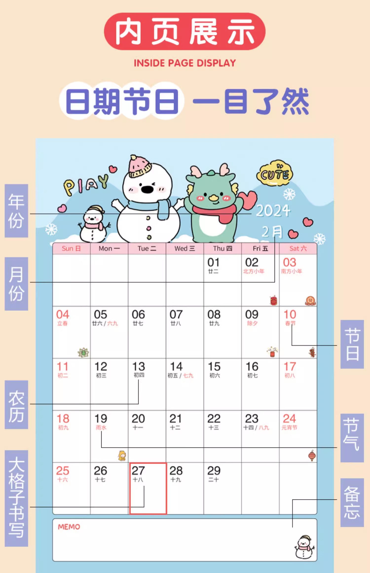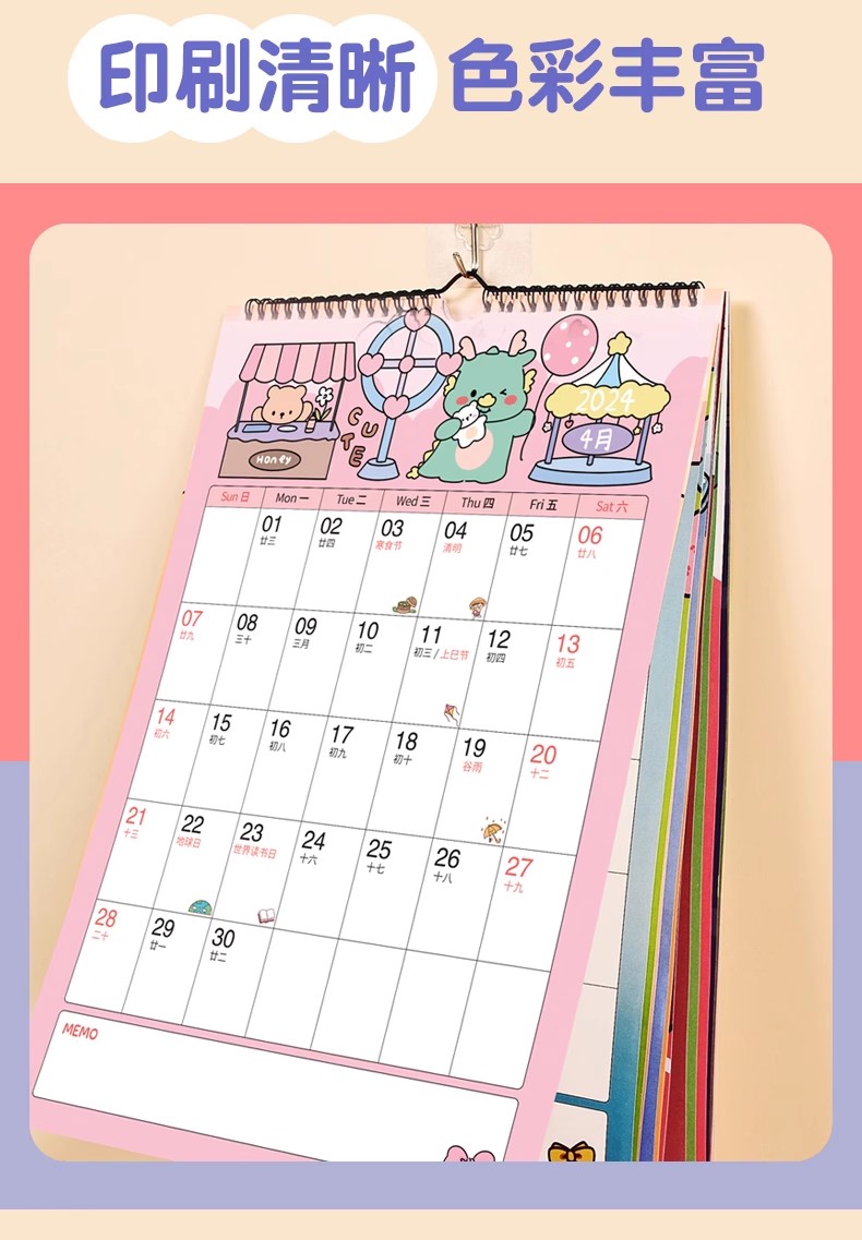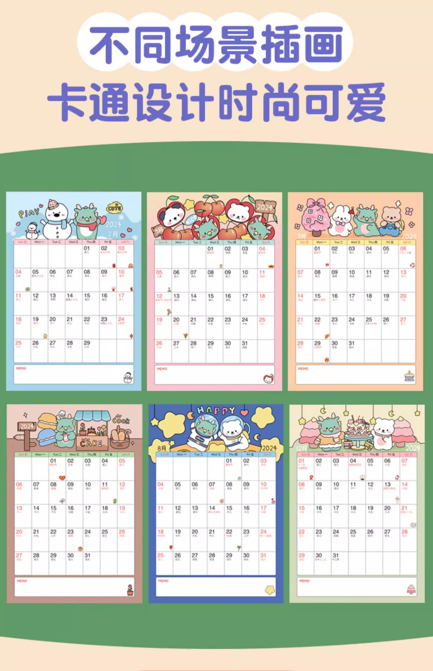 2024龍年A3壁掛けカレンダーシンプル月計画創意中国風A2号格子メモ帳カレンダー