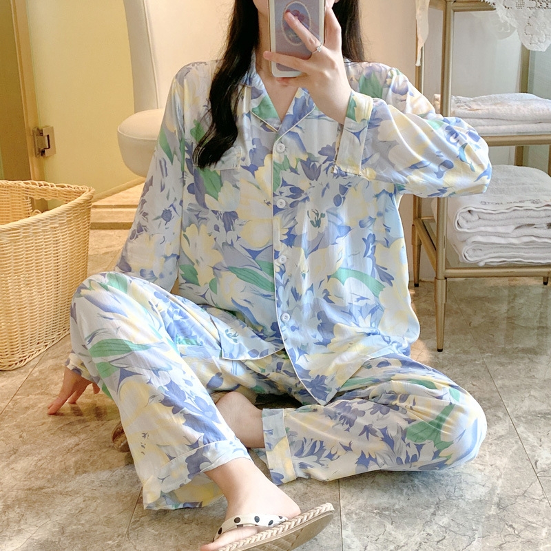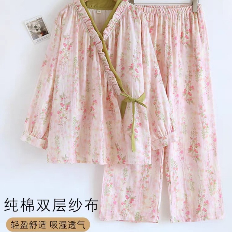 新款双层棉纱家居服斜襟长袖套装睡衣夏日玫瑰大码月子服吸湿透气