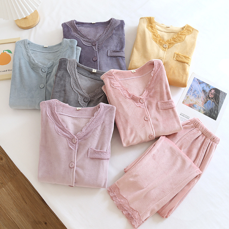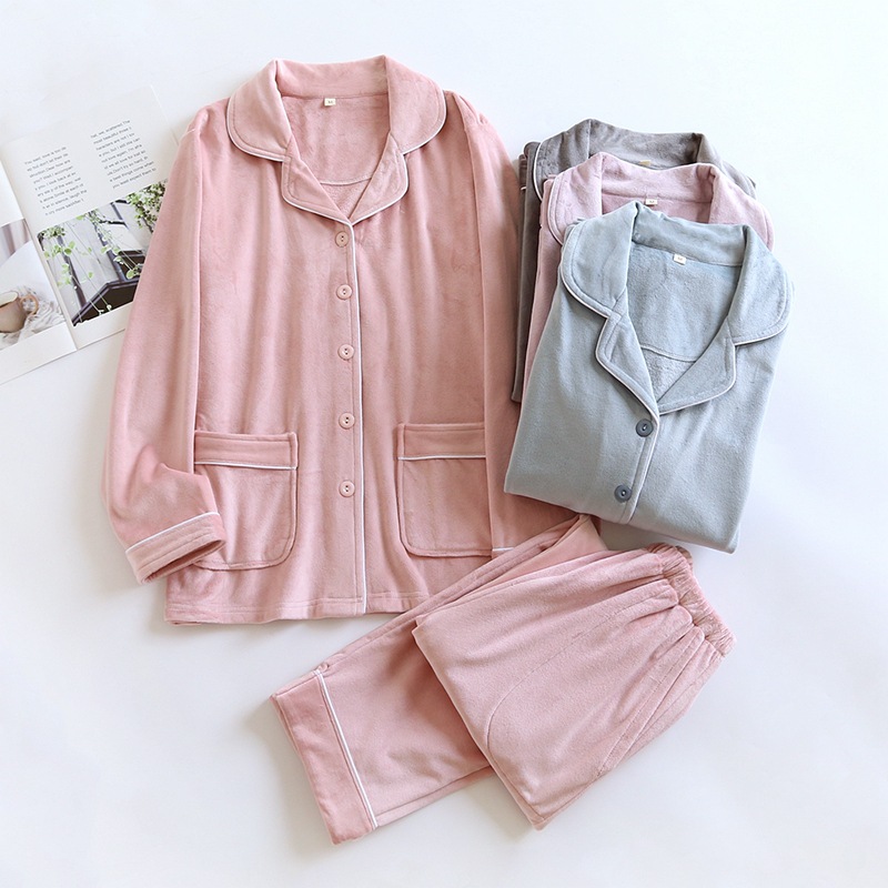 海島の絨毛のパジャマの女性の秋冬の薄い絨毛は4つの口の袋の長袖の保温のサンゴの絨毛のフランネルの家の服のスーツを持ちます。
