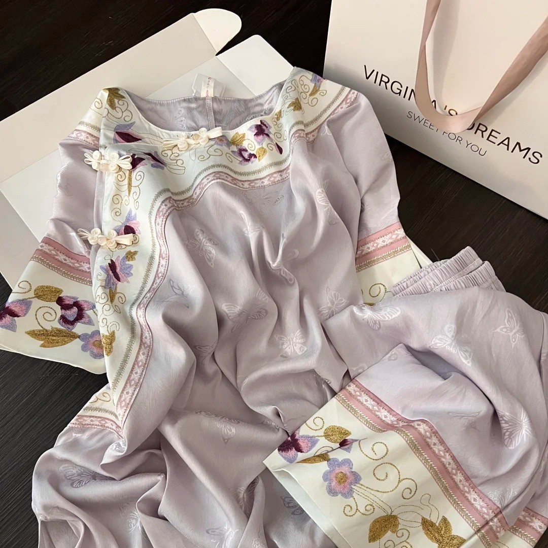 国风新中式复古紫色花卉睡衣女夏季古风短袖长裤套装大码家居服