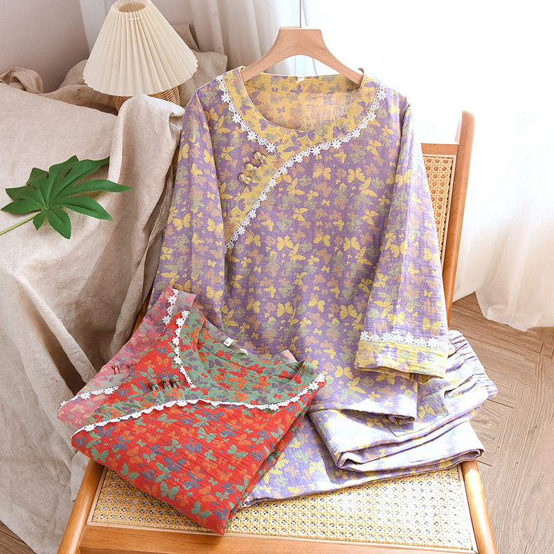 新中式纯棉双层纱布睡衣女士春秋夏季薄款国风九分袖九分裤家居服