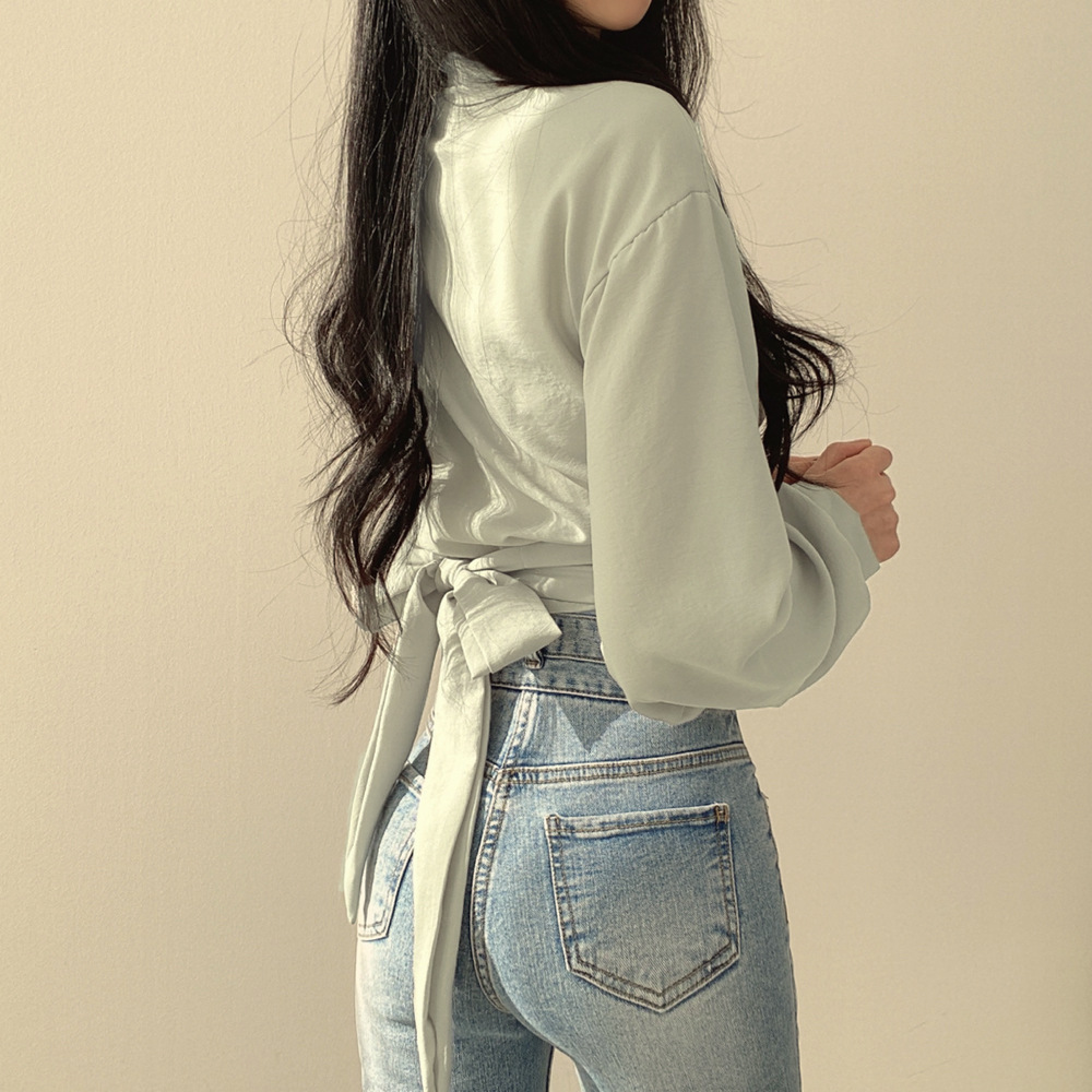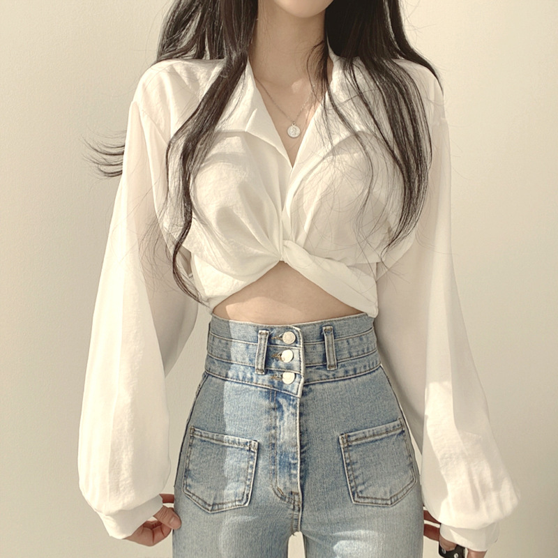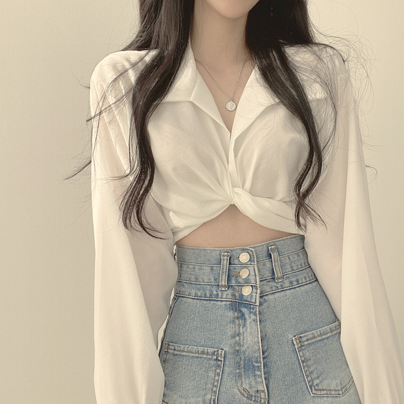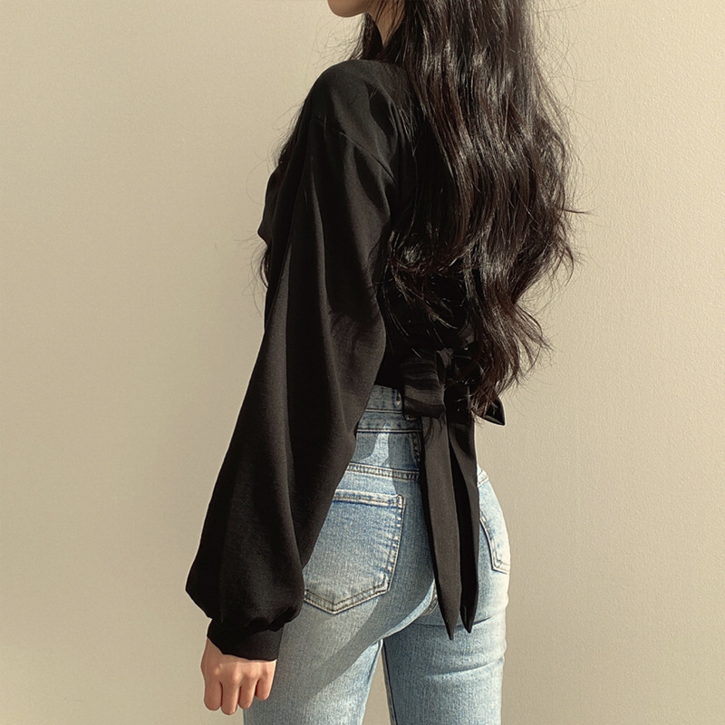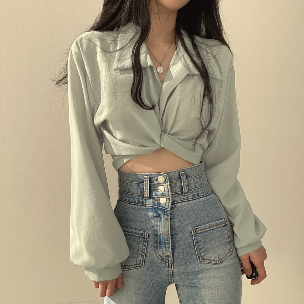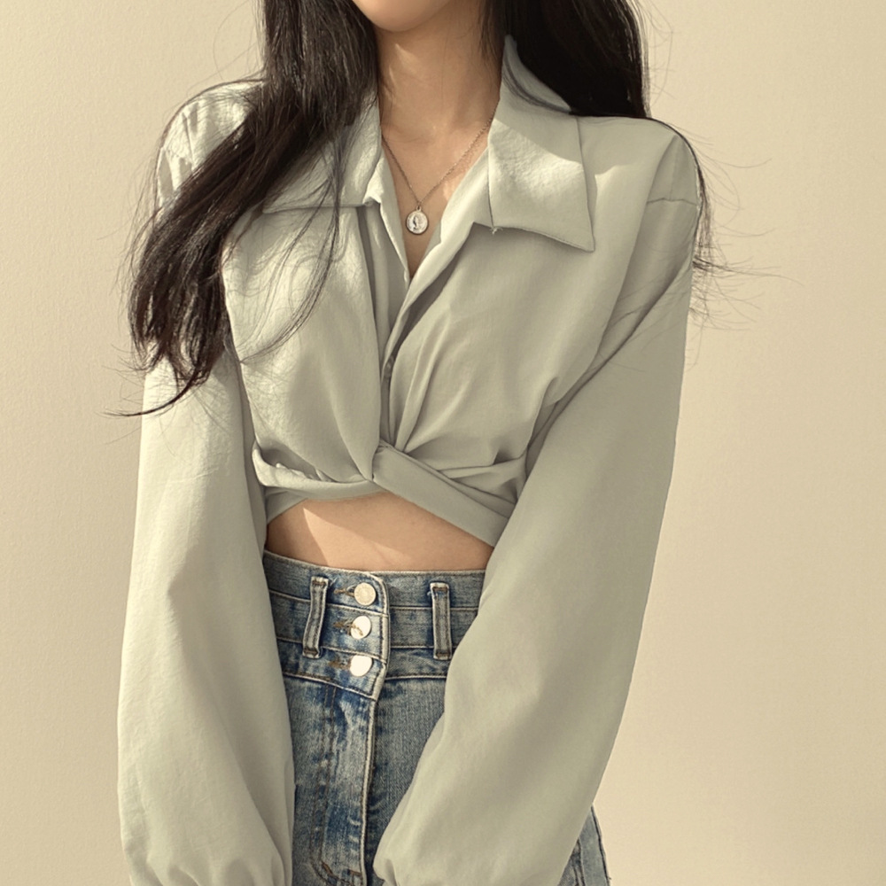 大衆のデザイン感poloシャツの高腰の短いタイプの臍の薄い長袖のシャツの夏の韓国版の蝶結びは腰の女性を収めます。