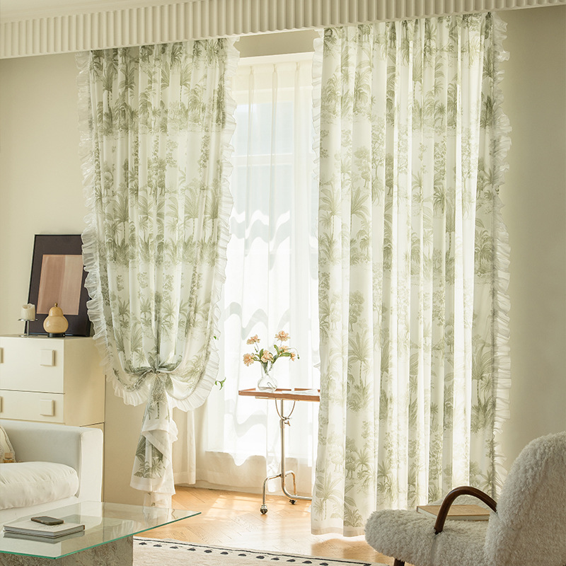 侘び寂び風グリーン生地植物プリントガーゼカーテン透光性非透視性リビングルーム寝室出窓卸売カーテン生地