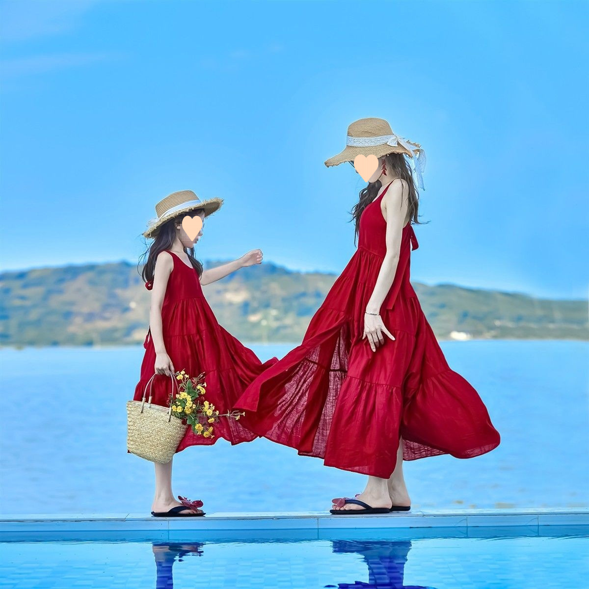 亲子裙夏装女童连衣裙洋气公主裙红色母女亲子装海边度假沙滩裙子