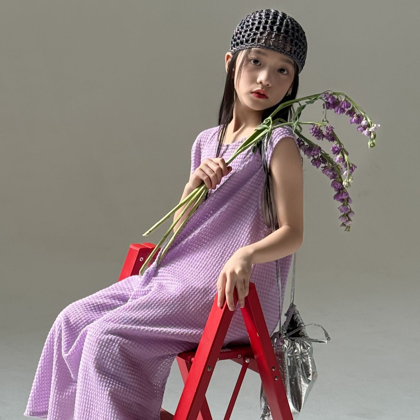 TCkids2025春夏の紫の透かし彫りの袖なしのベストのワンピースのカバーのスカートは休暇の長いスカートを重ねて着ます。