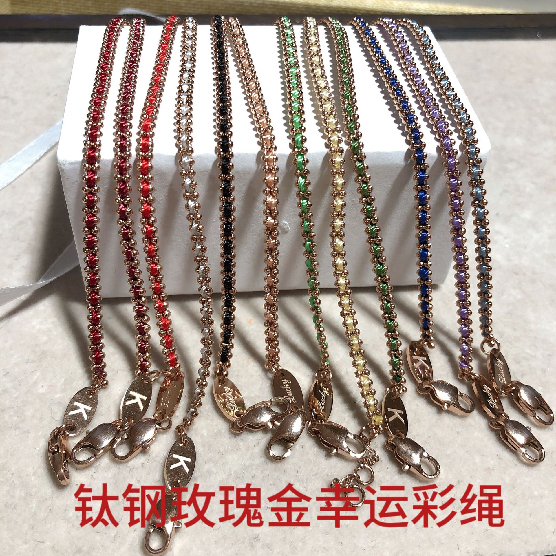 24年の新型チタン鋼は色を落とさないフランス式の幸運な幻の色の縄の赤い縄の小さい大衆のファッションのシングルは重ねて赤い本をかぶせます。