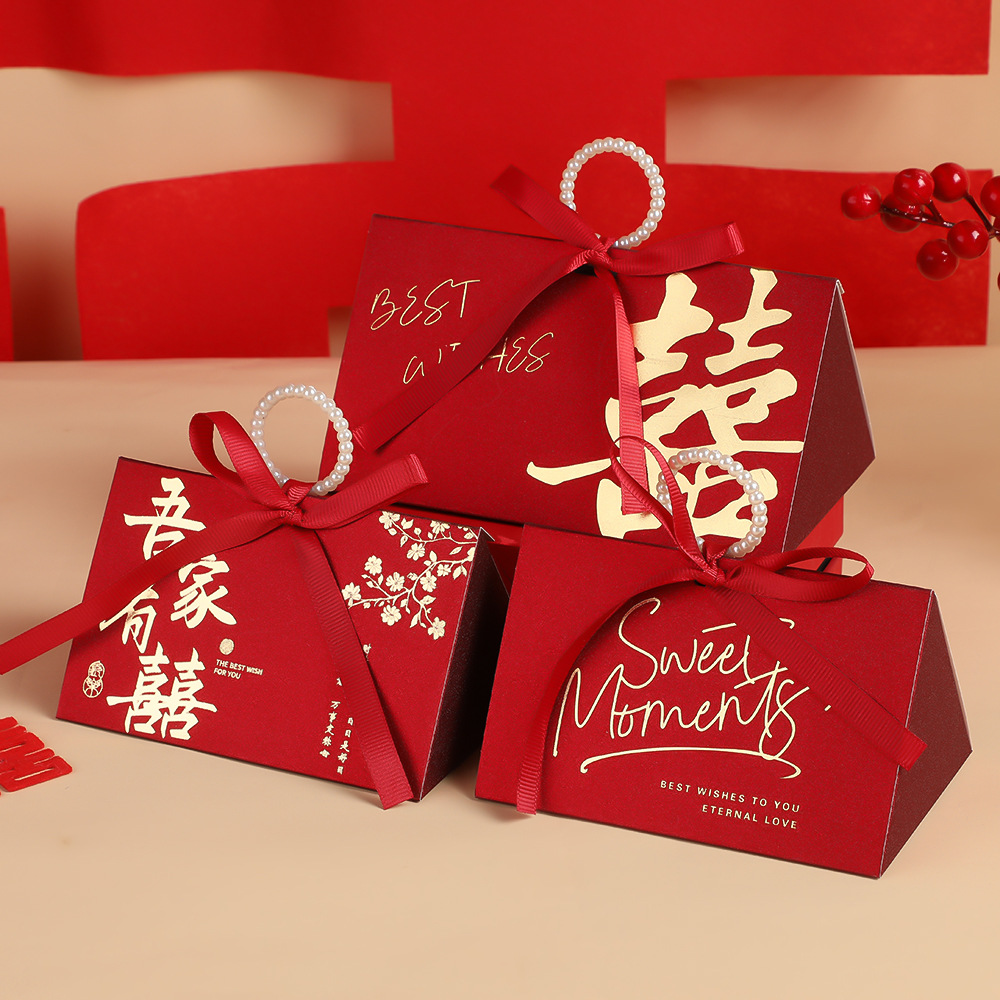 国风精美喜糖盒糖果包装盒三角形桌糖酒红磨砂烫金珍珠手提喜糖盒