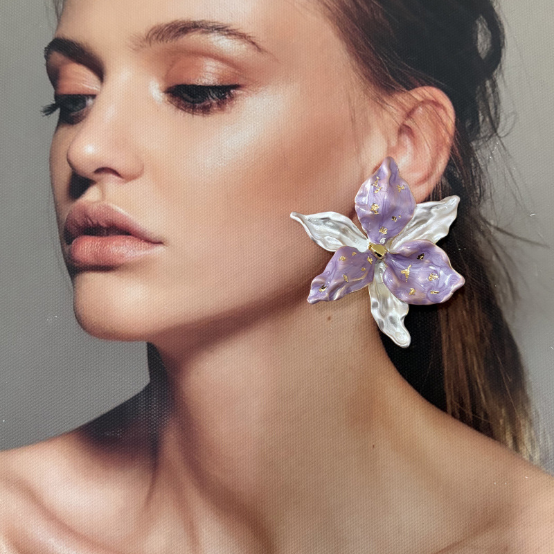 新款夸张时髦复古滴油白紫撞色立体莺尾花朵耳环轻奢高级感耳饰女