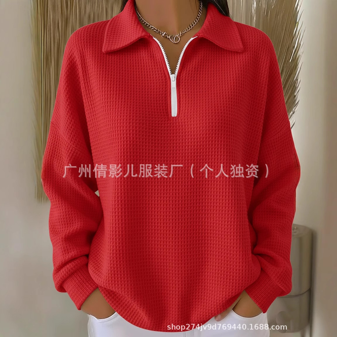 2025新款跨境纯色翻领套头落肩半拉链华夫格长袖女装POLO上衣