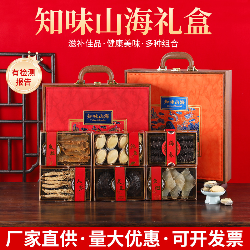 海参、アワビ、ギフトボックス入り中秋節年物ギフト、魚膠、羊肚菌、高麗人参、四種の海鮮乾物、高品質