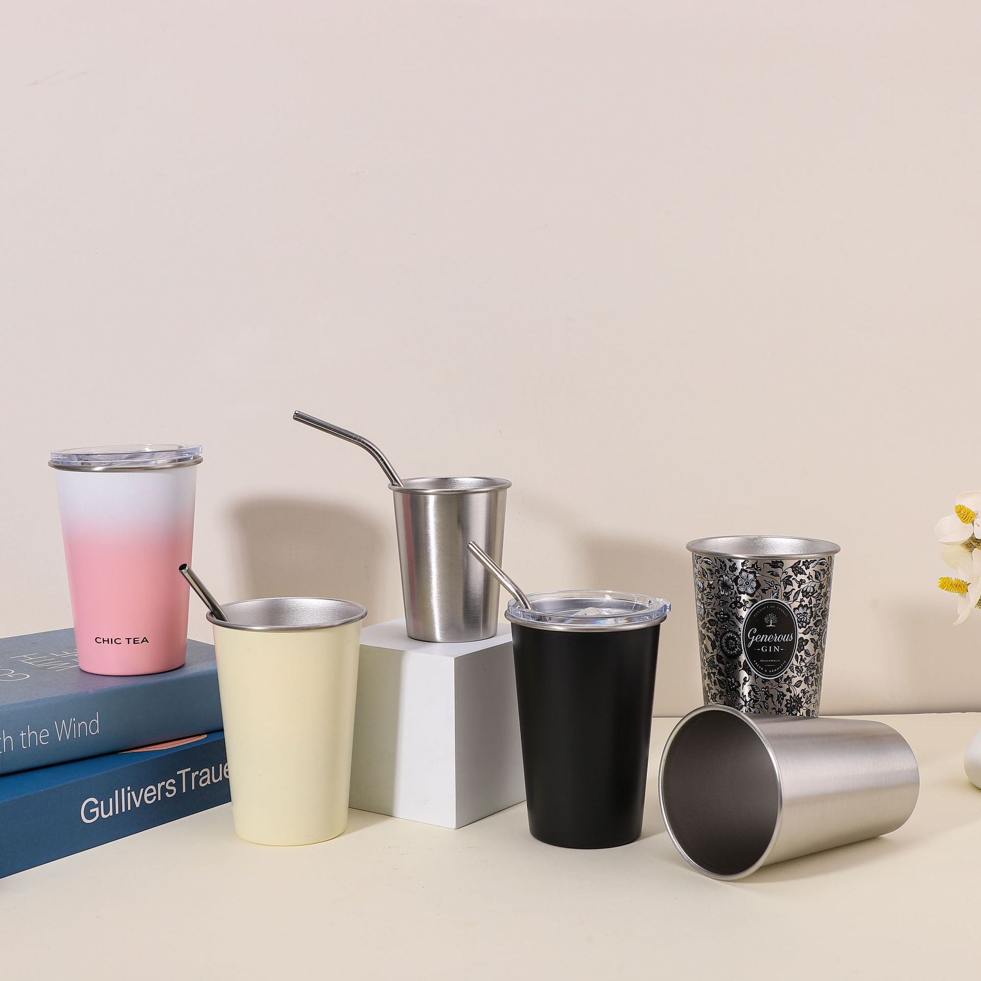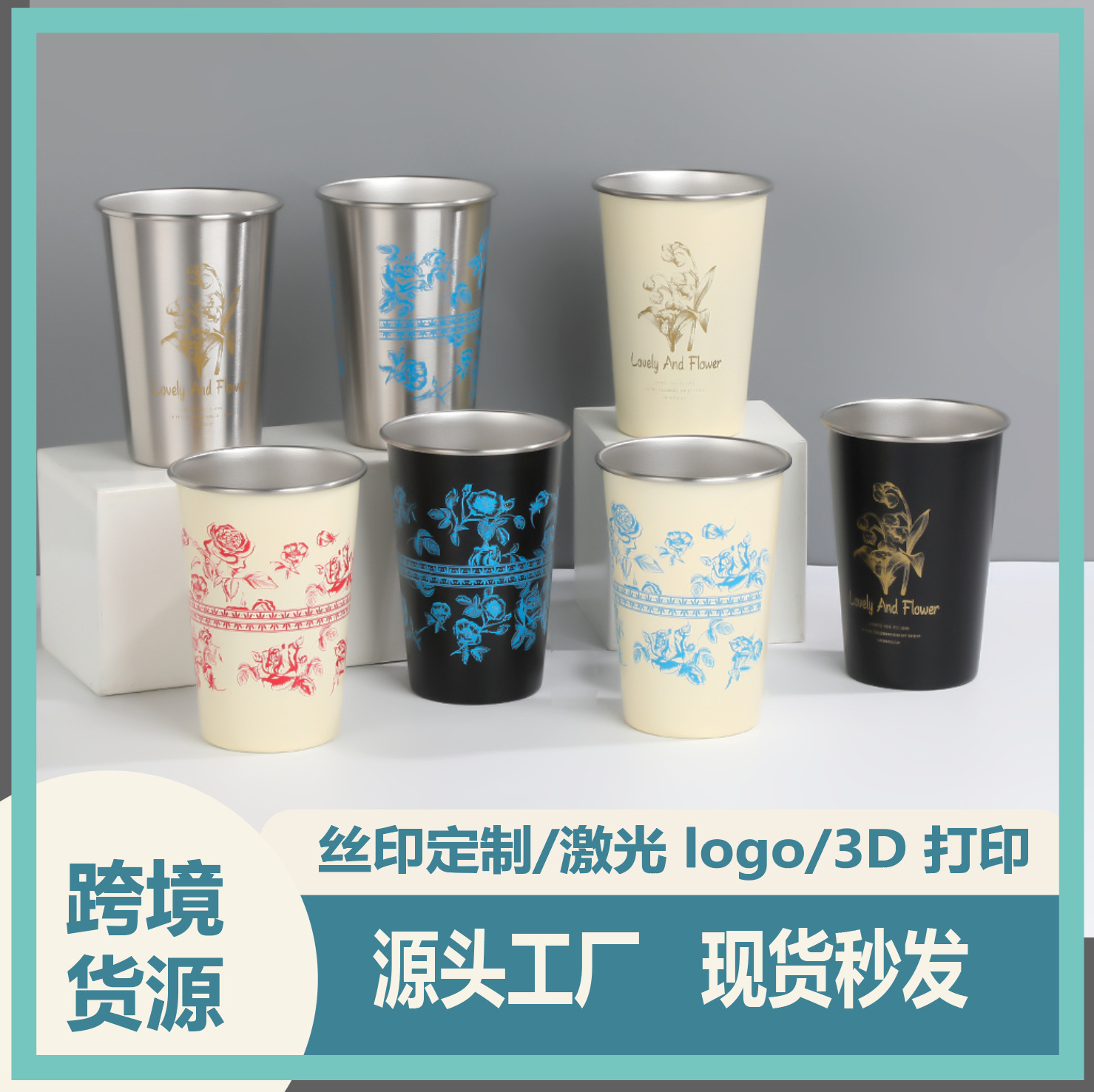 跨境欧式304不锈钢啤酒杯单层卷边防烫杯吸管户外咖啡杯户外适用