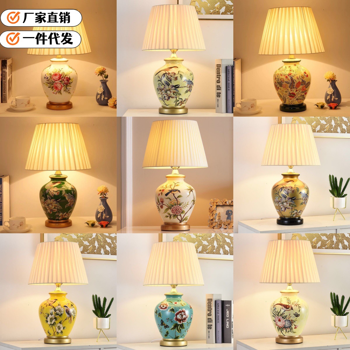 跨境爆品床头灯客厅美式复古新中式美式田园温馨创意遥控陶瓷台灯