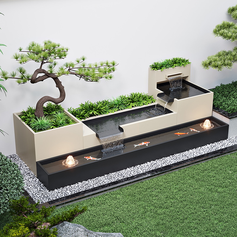 不锈钢流水景观池花箱鱼池组合户外庭院鱼池喷泉锈钢隔墙照壁