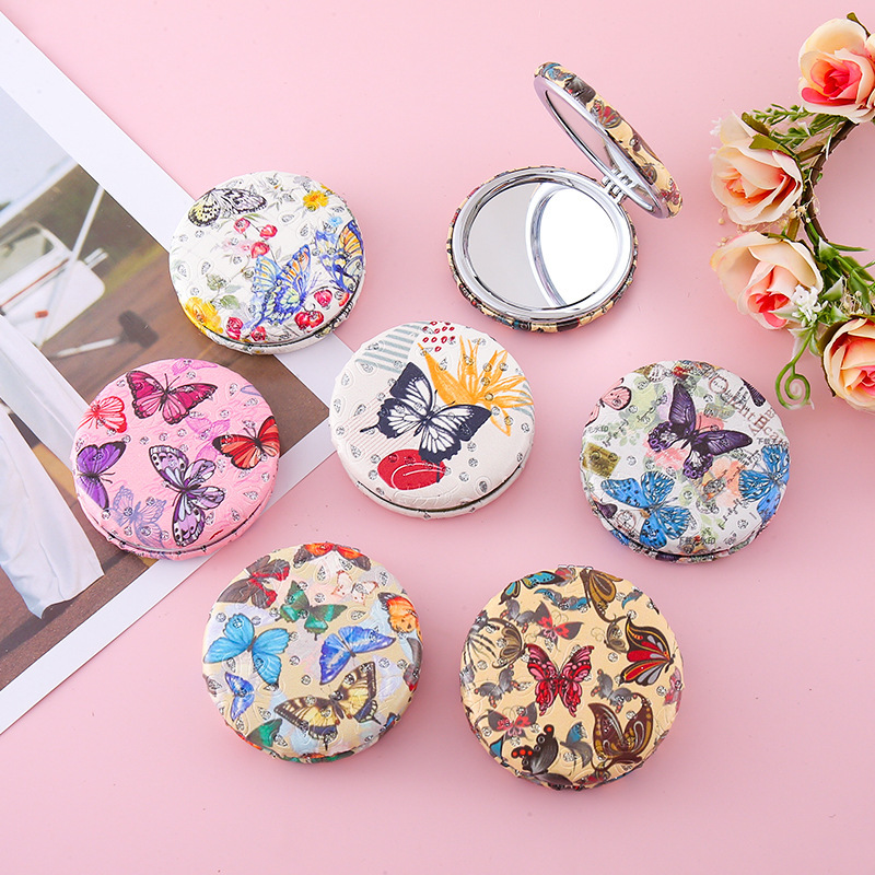 輸出用ダイヤモンド付き蝶型丸型小型鏡、ポータブルで移動可能なライト付き丸型ミニ折りたたみ化粧鏡卸売