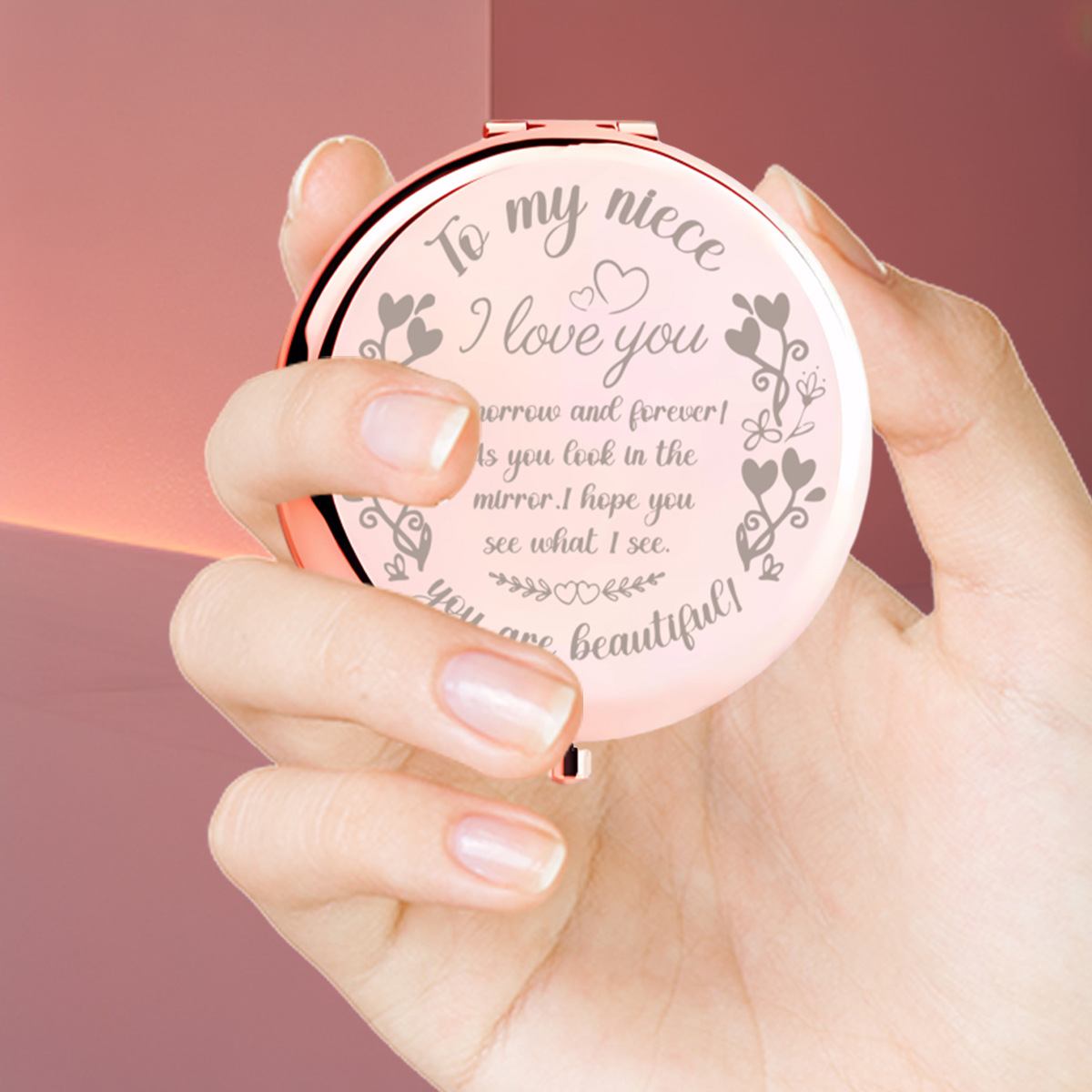 携帯型の化粧鏡を持っています。