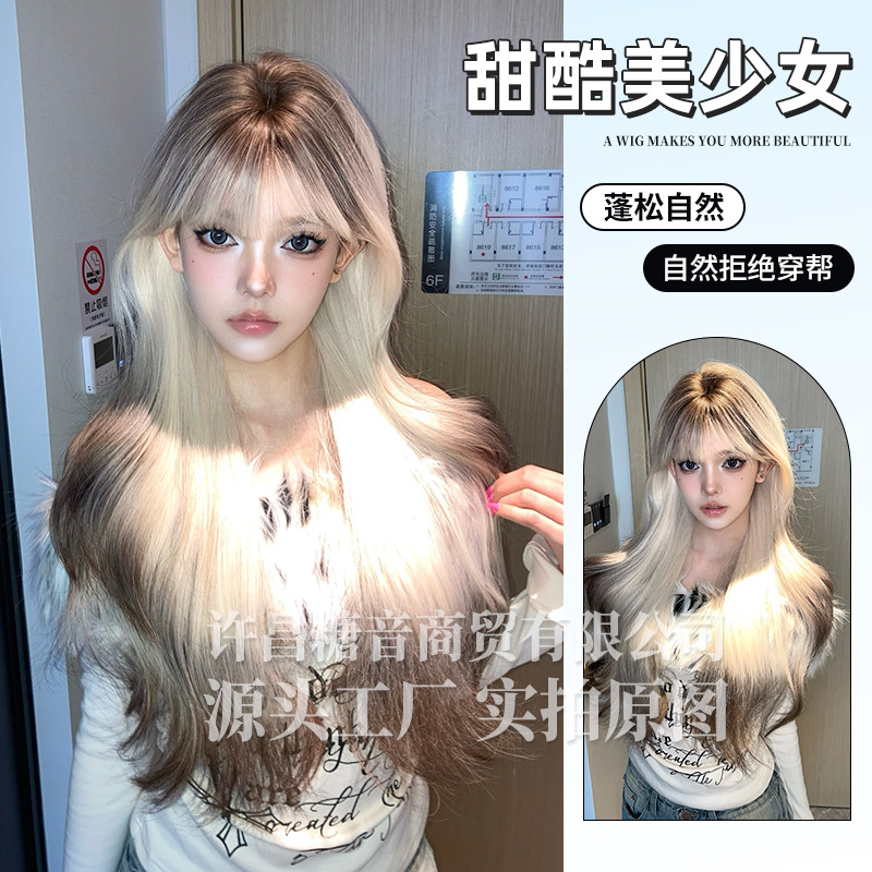 ロングカーリーヘアの女性用シュガーカラーウィッグ、ロリータ風リアルな韓国風前髪、エッグカールウィッグ、フルヘッドウィッグ