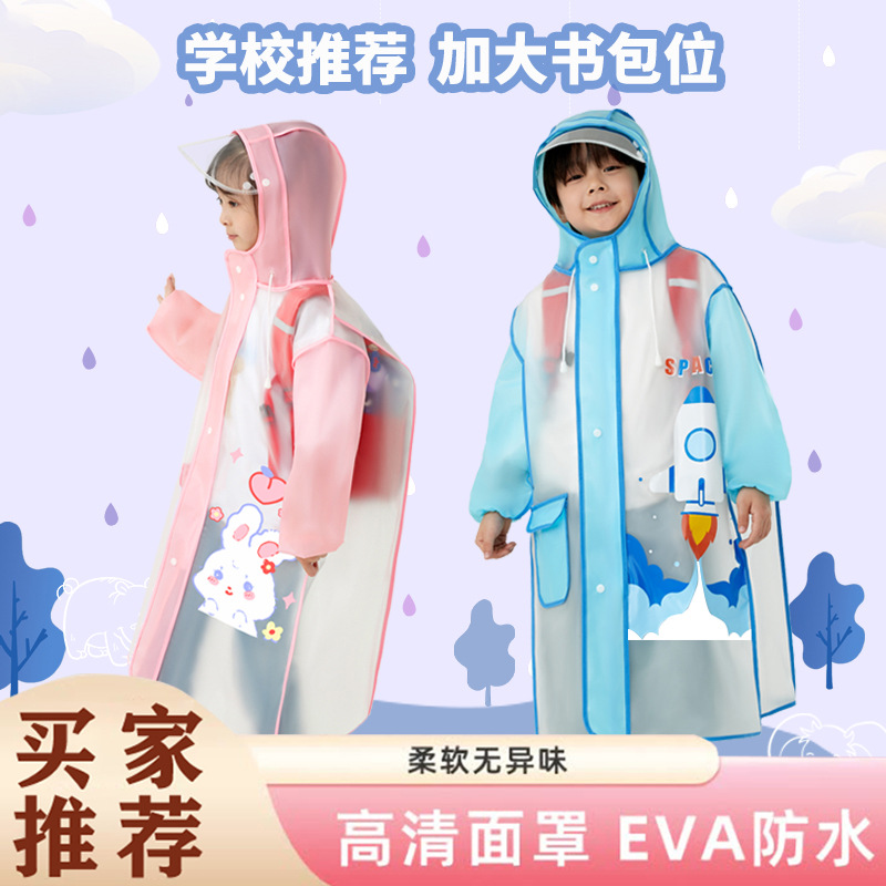インスタ映え韓国風子供用レインコート 厚手 バッグ収納可能 EVA二重帽子 小学生用 ロング丈全身レインコート 防水