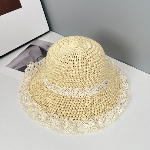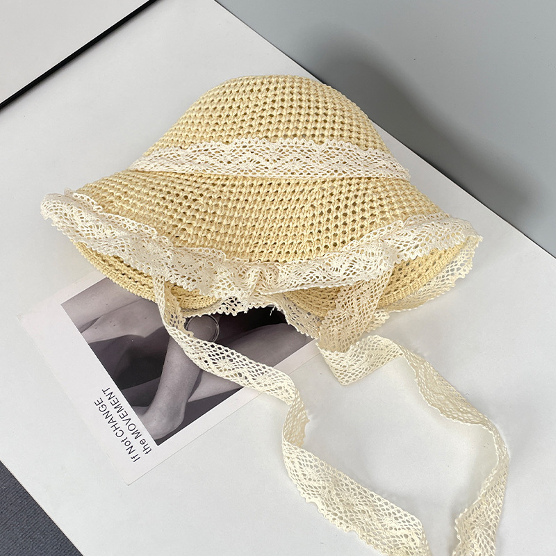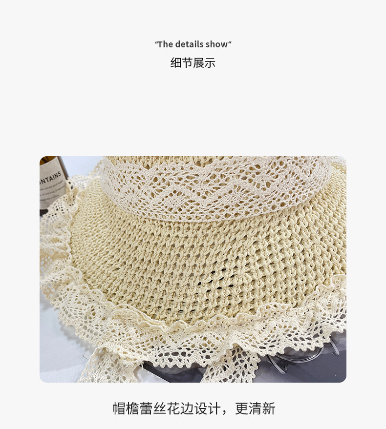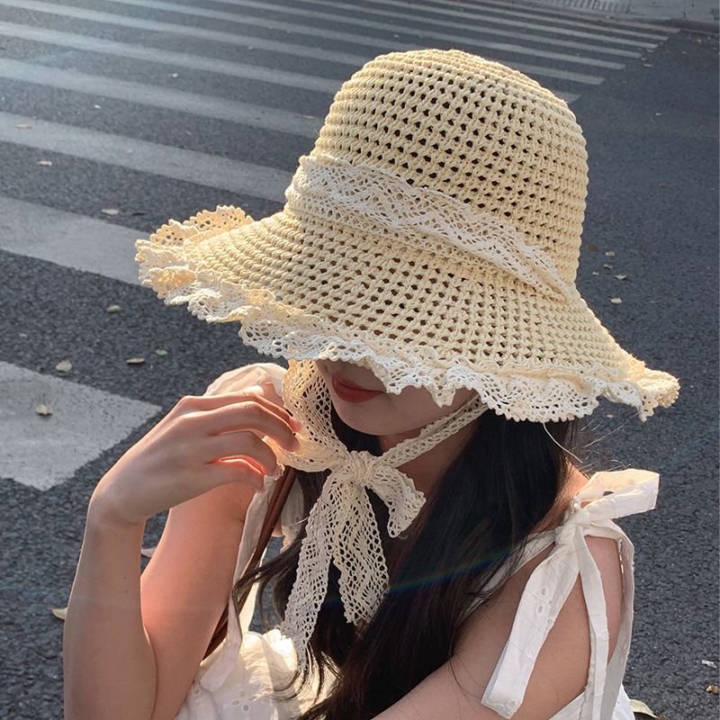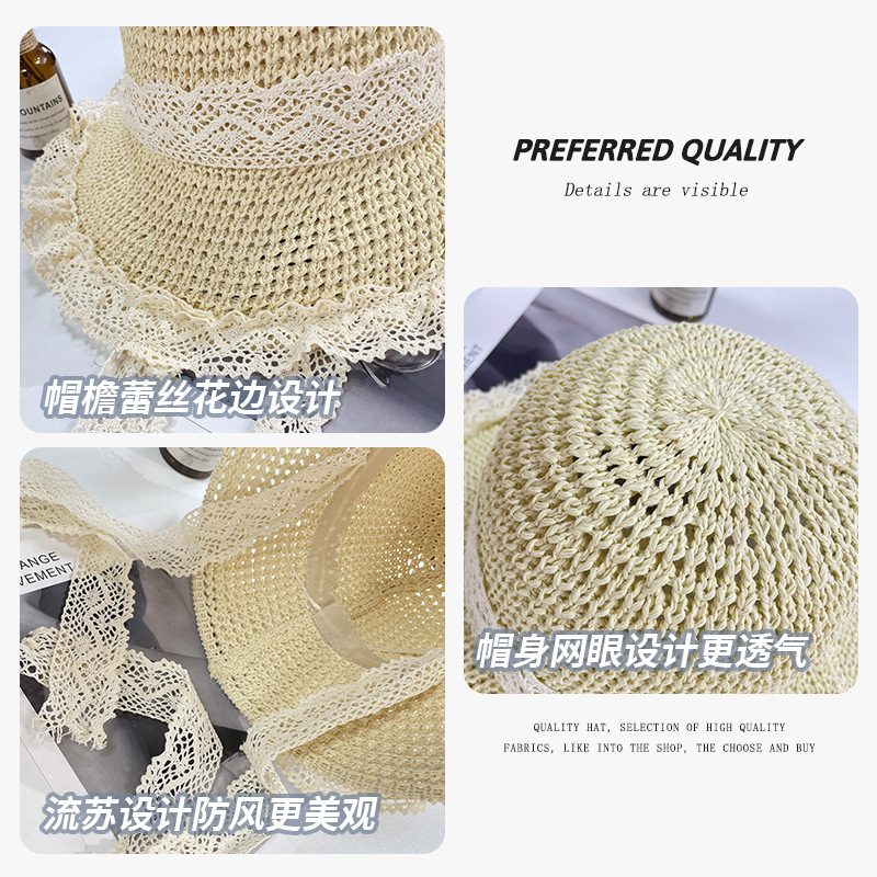 麦わら帽子の女性の大きな帽子のつばは韓国版の夏の透かし彫りの通気性の麦わら帽子の海辺のビーチの休暇の日よけの漁師の帽子を持ちます。
