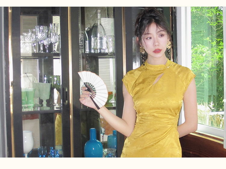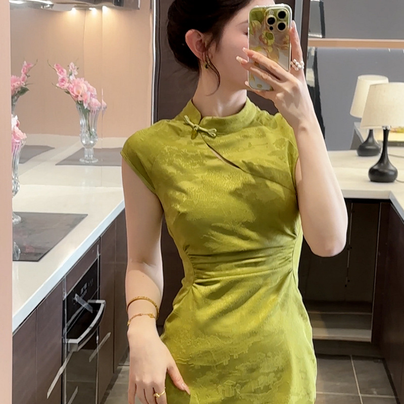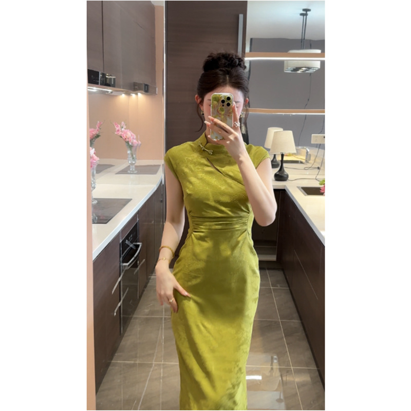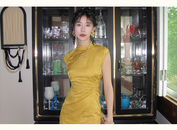 新中国中国風改良チャイナドレス襟修身ワンピース女性デザイン感小衆露肩包尻開叉中ロングスカート
